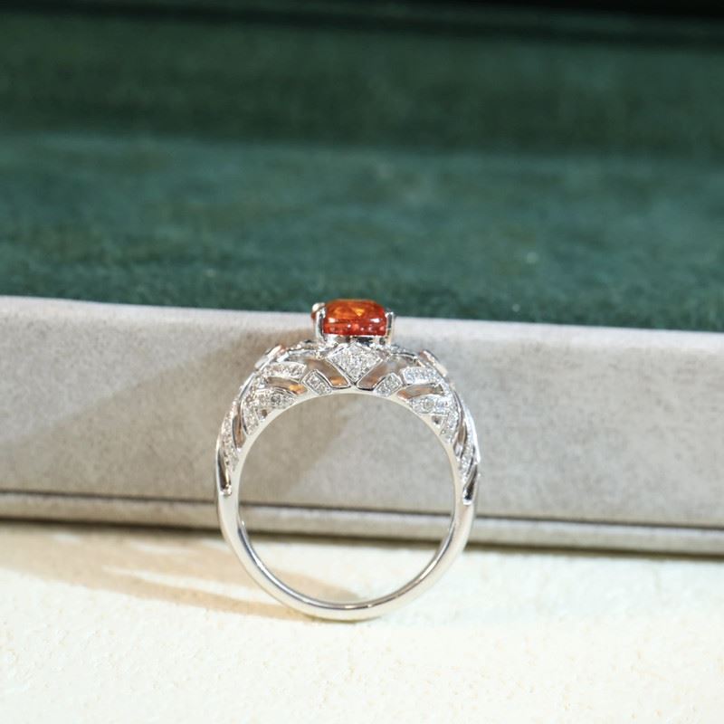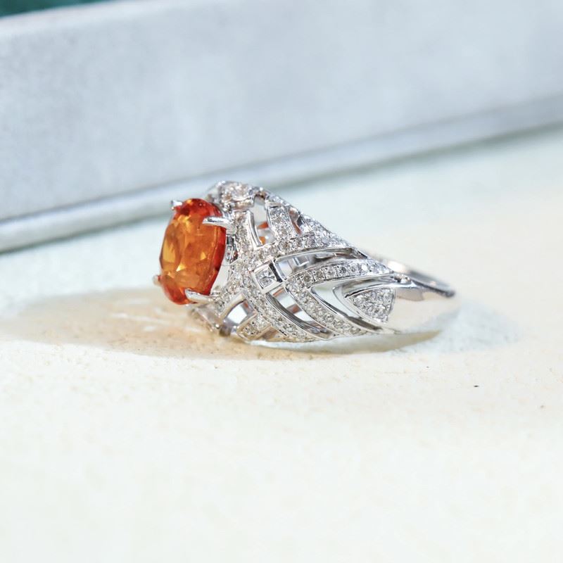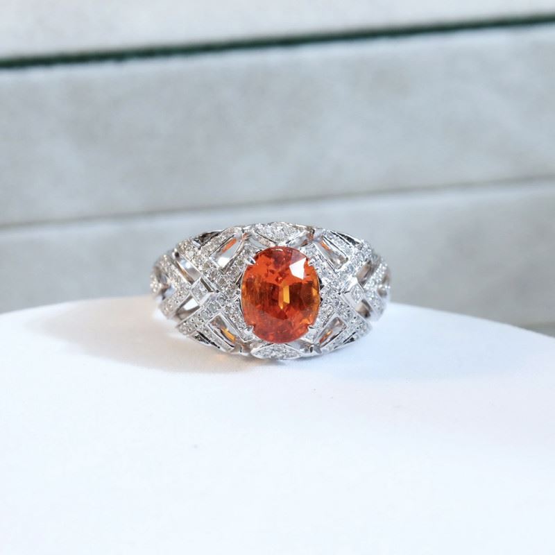 This 18K gold ring features a vibrant orange-red spessartite garnet at its center, surrounded by diamonds in a sophisticated crisscross design. The intricate craftsmanship and perfect fusion of the gemstone and diamonds create a piece that radiates luxury and timeless elegance.Ring size: 6, circumference: 52 mm, diameter: 16.6 mm, total weight: 6.25g.Note: GUILD certificate, comes with a jewelry, gemstone, and precious metal authentication certificate.