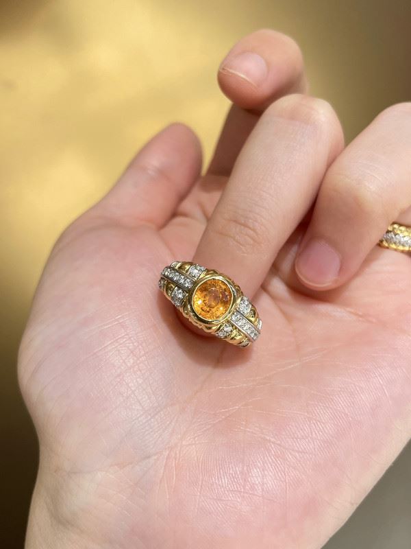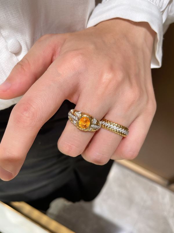 Crafted in 18K gold, this stunning ring features a vivid spessartite garnet, glowing with fiery orange brilliance. The band is adorned with sparkling diamonds that enhance the gem’s radiance. A bold yet elegant design that embodies confidence and luxury.Ring size: 6, circumference: 52 mm, diameter: 16.6 mm, total weight: 7.81g.Note: GUILD certificate, comes with a jewelry, gemstone, and precious metal authentication certificate.