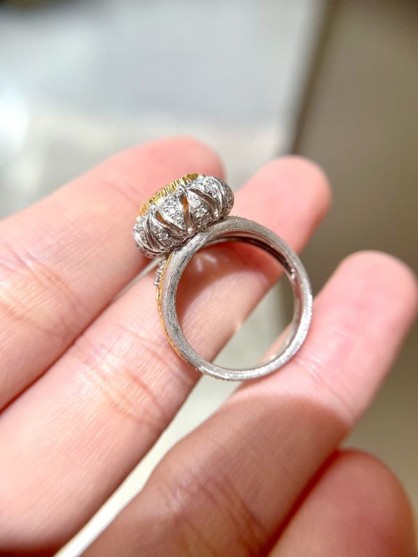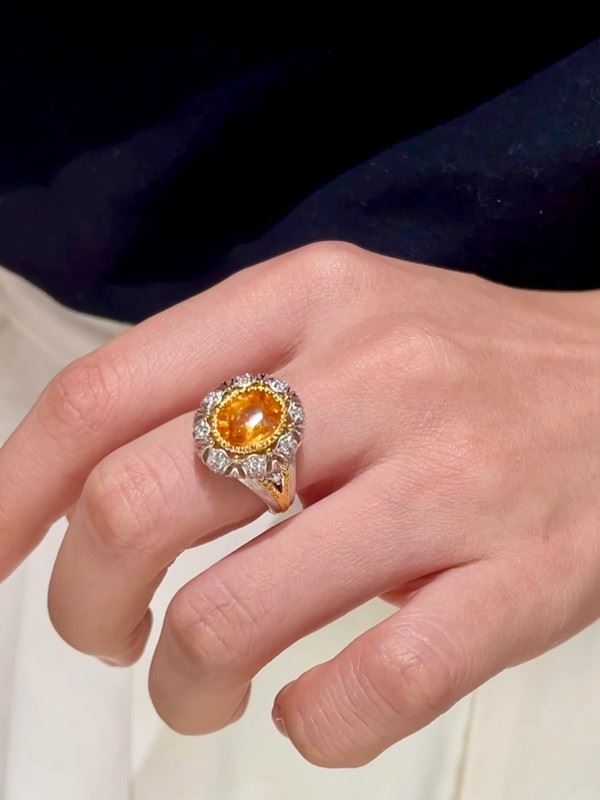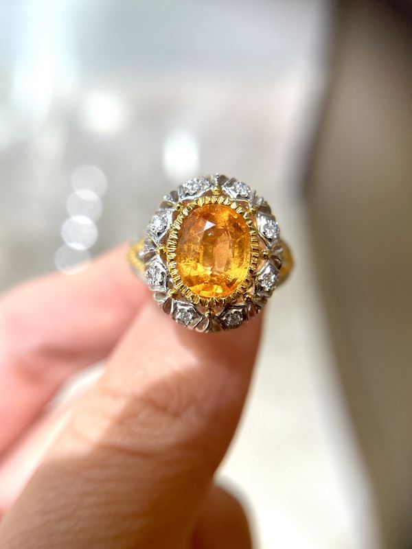 This 18K gold ring features a stunning spessartite garnet at its center, glowing with a vibrant orange-red hue. Surrounded by diamonds, the design exudes luxury and elegance. The intricate metalwork perfectly complements the gemstone, blending both classic and modern elements to create a piece that radiates nobility.Ring size: 6, circumference: 52 mm, diameter: 16.6 mm, total weight: 7.34g.Note: GUILD certificate, comes with a jewelry, gemstone, and precious metal authentication certificate.