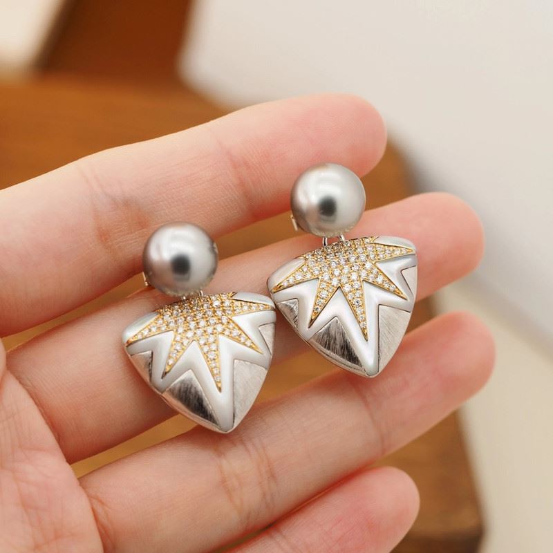 These 18K gold Tahitian pearl earrings combine modernity and elegance, featuring shimmering diamonds and Tahitian pearls. The unique star-shaped design exudes an artistic flair, with delicate metal lines complementing the lustrous pearls to showcase a noble and unique style.Total weight: 12.51g.Note: GUILD certificate, comes with a jewelry, gemstone, and precious metal authentication certificate.