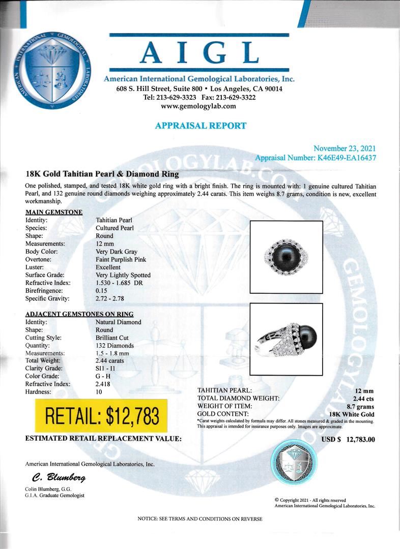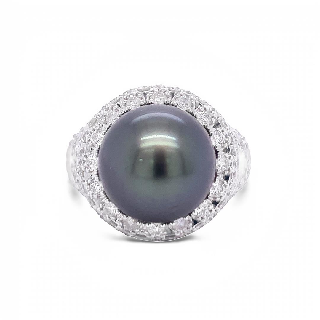 18K Gold Tahitian Pearl Ring. Please see Photos and Description for all available information. This stunning Tahitian pearl ring showcases 132 diamonds weighing 2.44 cts. The pearl is symmetrically placed in the center of the ring. The Tahitian pearl is known for its bright luster and iridescent overtones, making it the perfect choice for this elegant but unique ring.