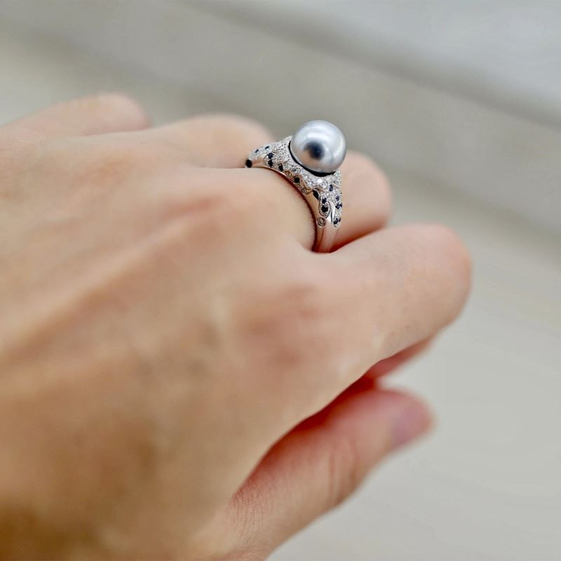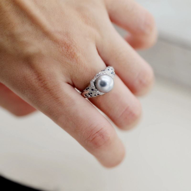 This 18K gold Tahitian pearl ring features a unique Tahitian pearl at its center, surrounded by sparkling diamonds and sapphires, exuding luxury and nobility. The distinctive hue of the Tahitian pearl complements the surrounding gemstones, creating a romantic and refined aesthetic. Ideal for special occasions, it perfectly showcases the wearer’s elegance and taste.Ring size: 6, circumference: 52 mm, diameter: 16.6 mm, total weight: 6.96g.Note: GUILD certificate, comes with a jewelry, gemstone, and precious metal authentication certificate.