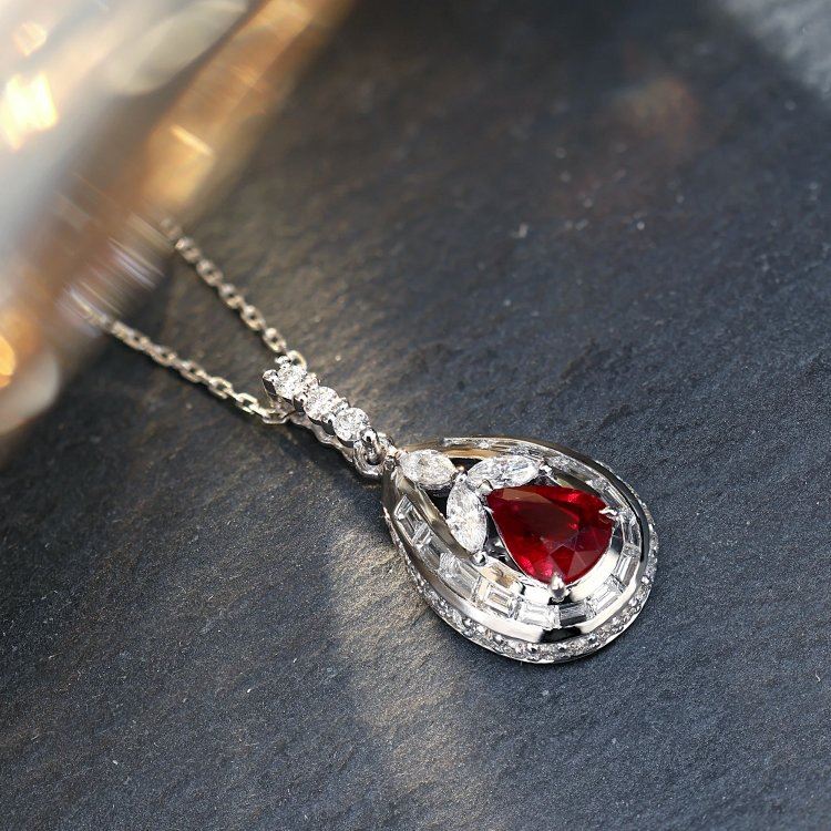 This 18K gold pendant features a teardrop-shaped ruby surrounded by diamonds and delicate geometric patterns. The vivid red gem contrasts beautifully with the brilliance of the diamonds, embodying both elegance and passion.Total weight: 2.07g.Note: GUILD certificate, comes with a jewelry, gemstone, and precious metal authentication certificate.