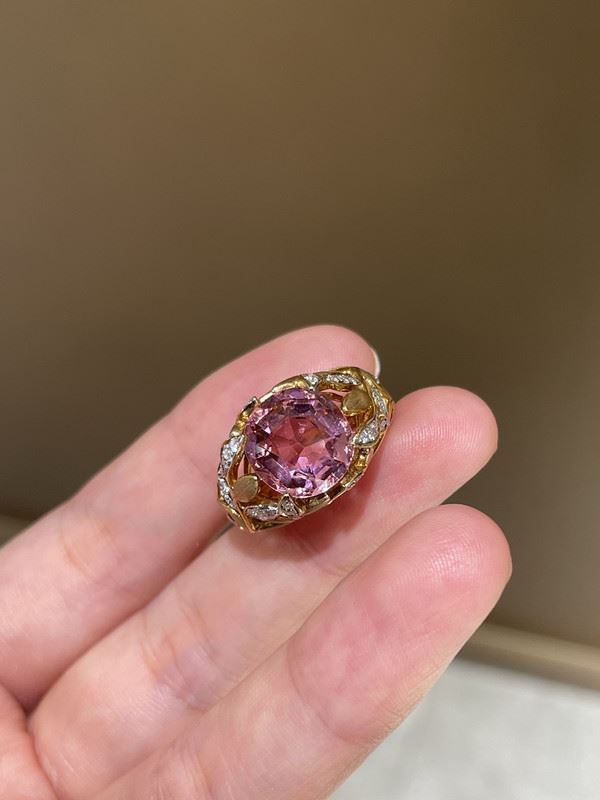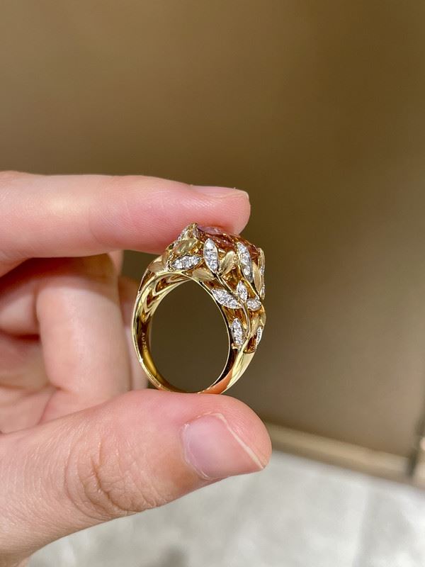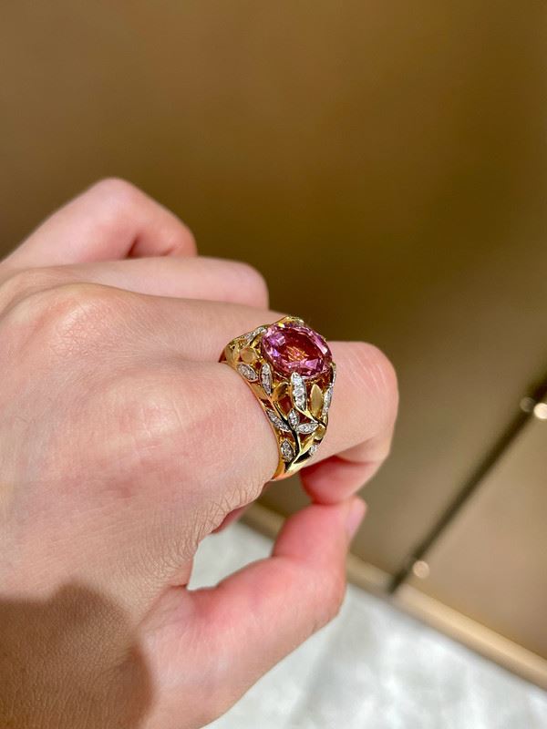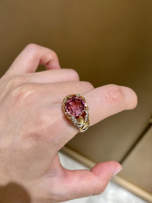 This 18K gold tourmaline diamond ring features a stunning central tourmaline gemstone, surrounded by exquisite diamond accents, showcasing extraordinary luxury. The perfect combination of gold and diamonds makes it even more dazzling and charming, perfect for special occasions and as a gift.Ring size: 6, circumference: 52 mm, diameter: 16.6 mm, total weight: 8.13g.Note: GUILD certificate, comes with a jewelry, gemstone, and precious metal authentication certificate.