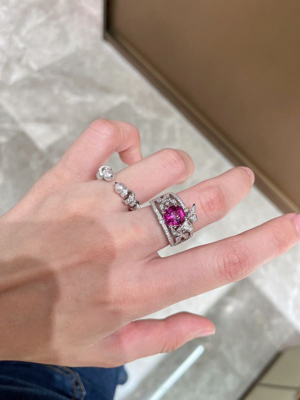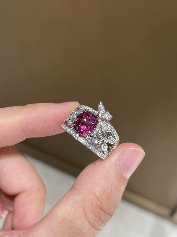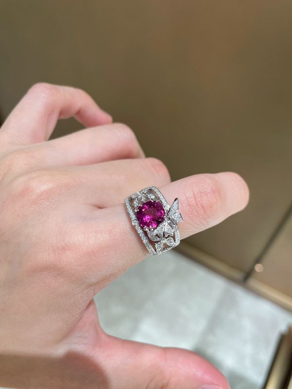 This 18K gold ring features a captivating pink tourmaline, surrounded by sparkling diamonds that enhance its luxurious brilliance. The finely crafted band blends modern and classic elements, exuding an elegant and regal aura, making it a highly attractive piece of jewelry.Ring size: 6, circumference: 52 mm, diameter: 16.2 mm, total weight: 8.05 g.