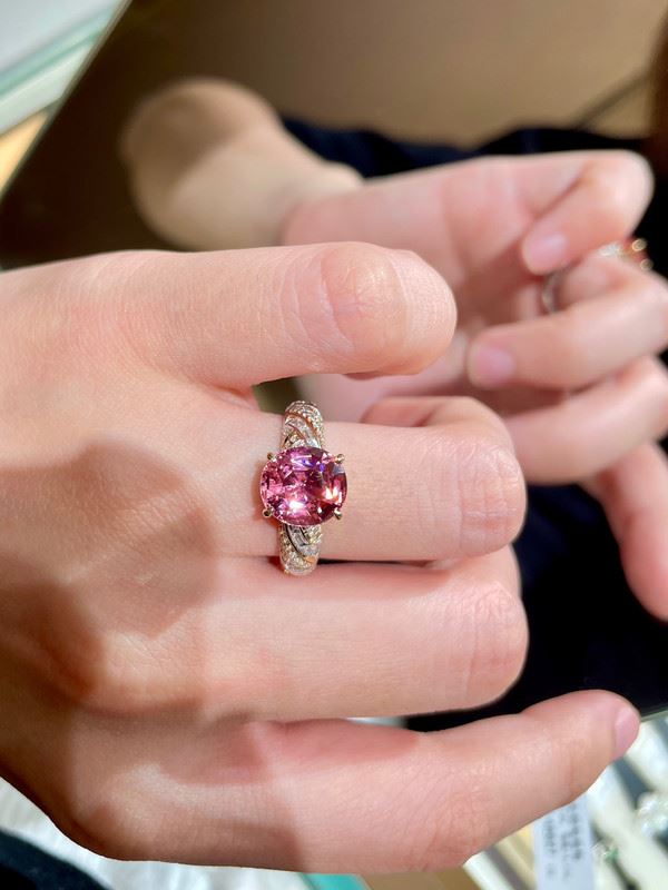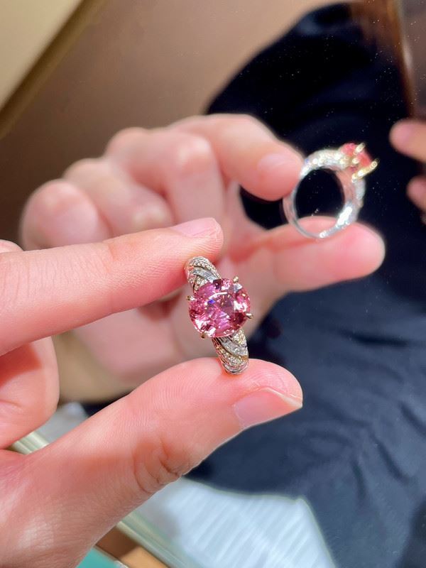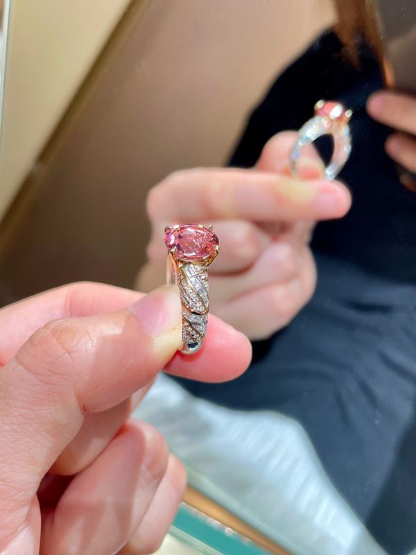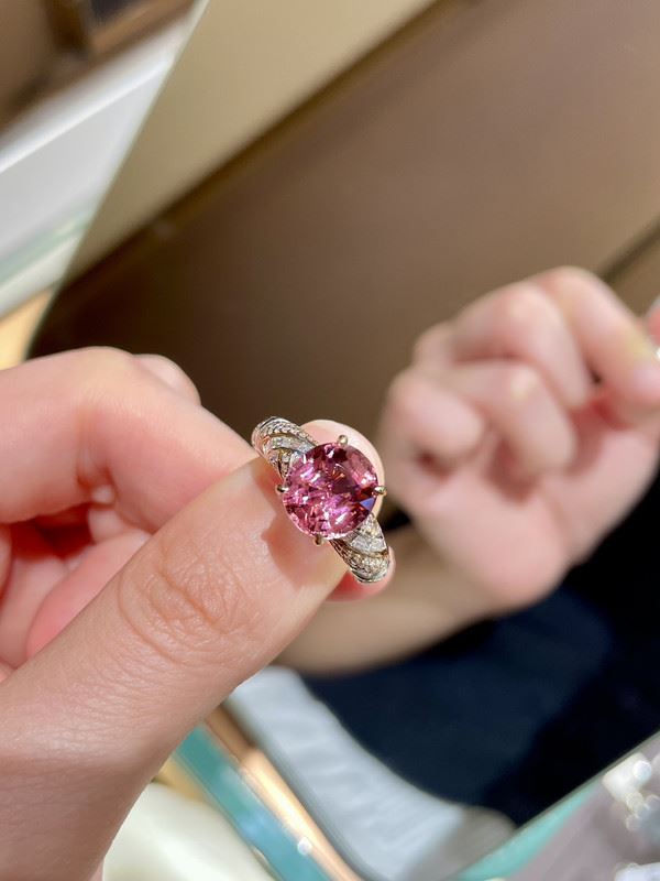 This exquisite 18K gold ring features a delicate pink tourmaline at its center, glowing with a soft, radiant shine. The band is adorned with fine diamonds, creating a luxurious sparkle, while the smooth design adds a modern touch. The overall look is elegant and regal, showcasing a unique sense of style.Ring size: 6.5, circumference: 53 mm, diameter: 17 mm, total weight: 4.82g.Note: GUILD certificate, comes with a jewelry, gemstone, and precious metal authentication certificate.