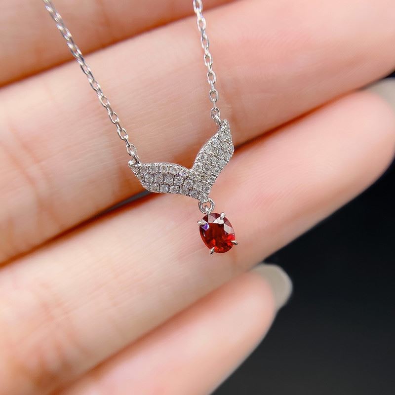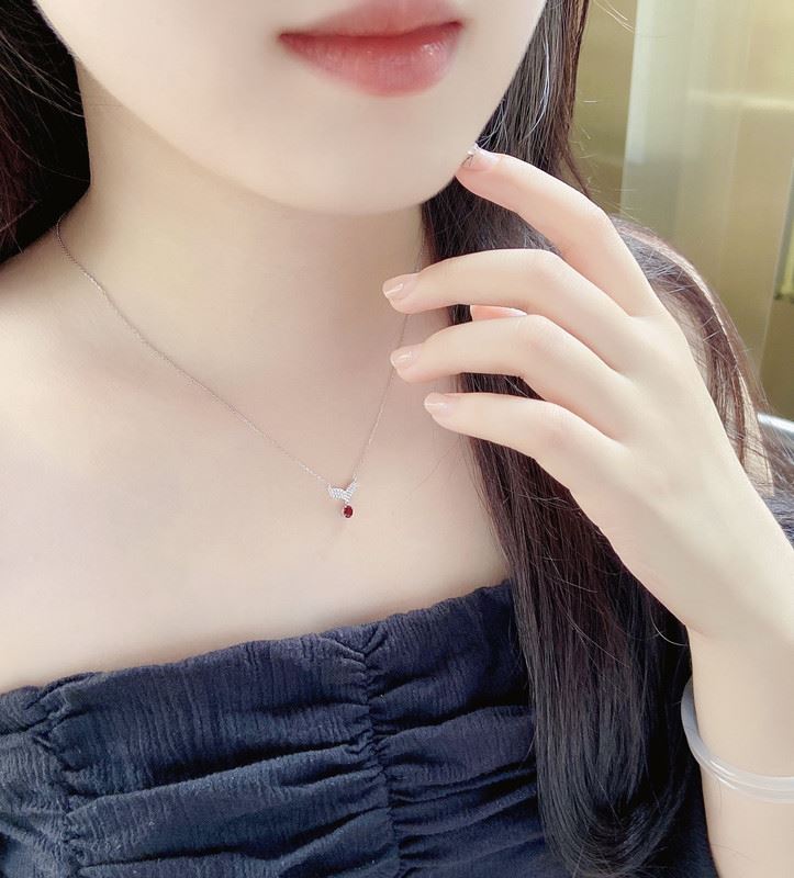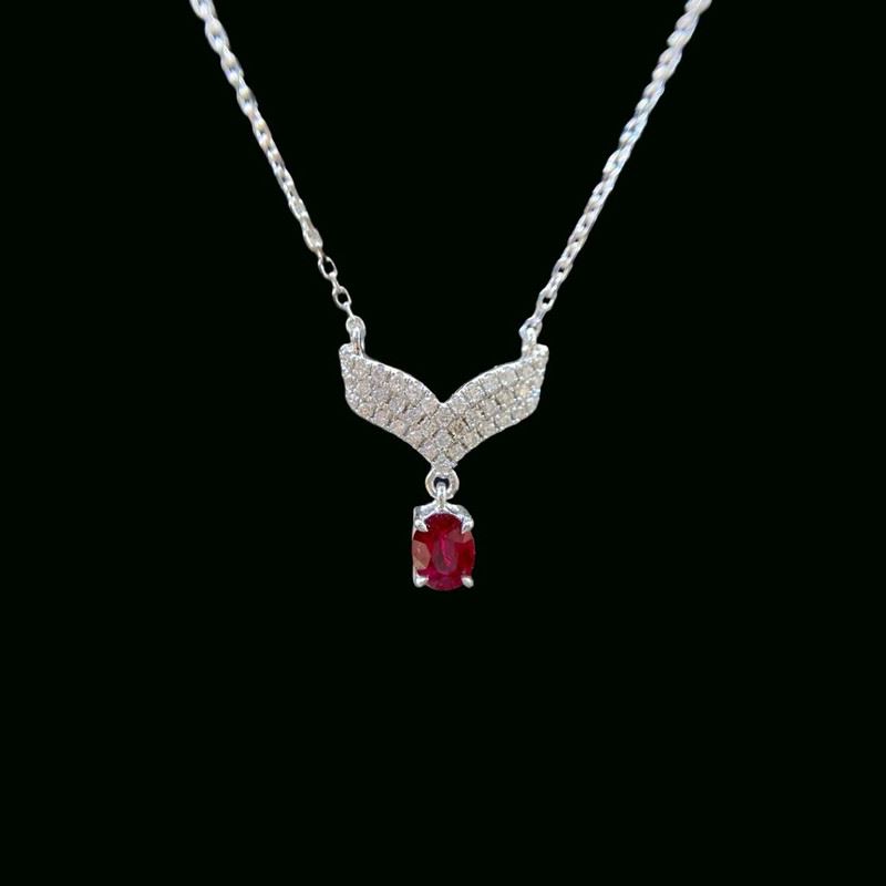 Crafted in 18K gold, this V-shaped diamond pendant gracefully frames an oval ruby centerpiece. The vivid contrast of red and white radiates brilliance, blending elegance with a touch of bold sophistication.Main stone: 0.252ct, side stones: 0.098ct. Note: Comes with an AGL certificate and a domestic jewelry identification certificate.