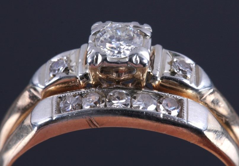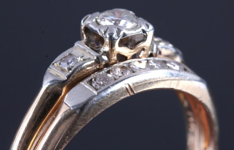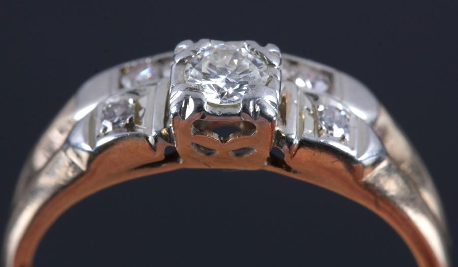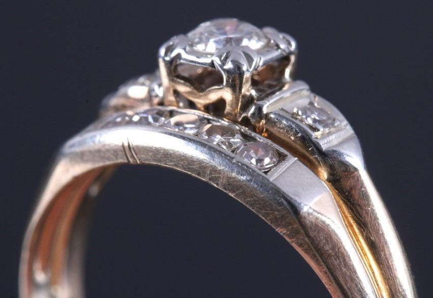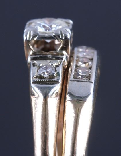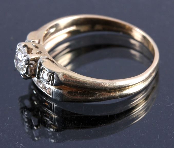 This is an 18K gold and diamond ring. The ring is marked "14K" and "18K" and shows a center diamond with a diamond on each side. The other side shows five diamonds all set in gold. The ring is in good condition. It is size 7.