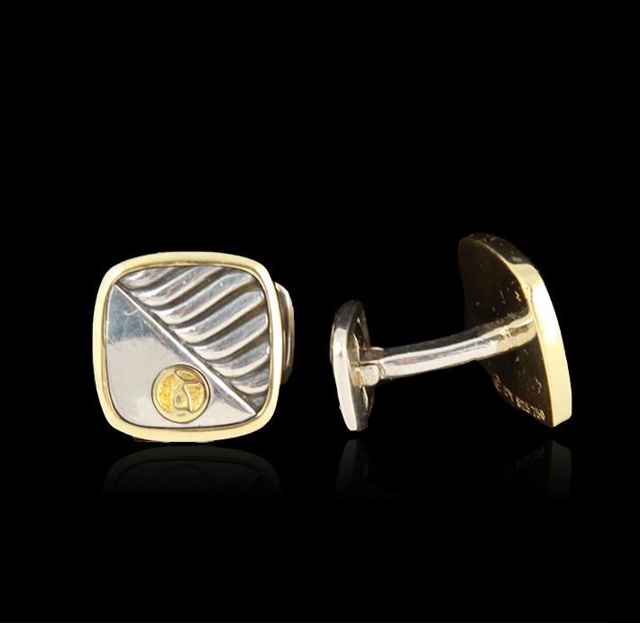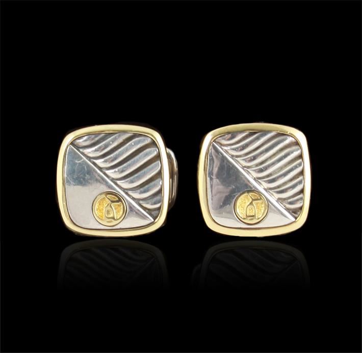 One pair of gorgeous David Yurman DY Logo classic cable men's 18K gold & sterling cufflinks. They feature a beautiful combination of silver cable design and the 18K gold DY logo on an 18K gold base. The cufflinks have been engineered with great craftsmanship, an is shown very elegantly. This is truly the perfect addition to your cufflinks collection. Comes in original DY pouch!