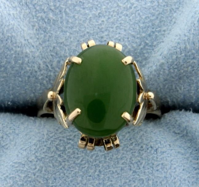 The ring is 18K yellow gold with an ornate design around a 5ct jade gemstone that has a deep green color. Size 6 1/4 2.6g