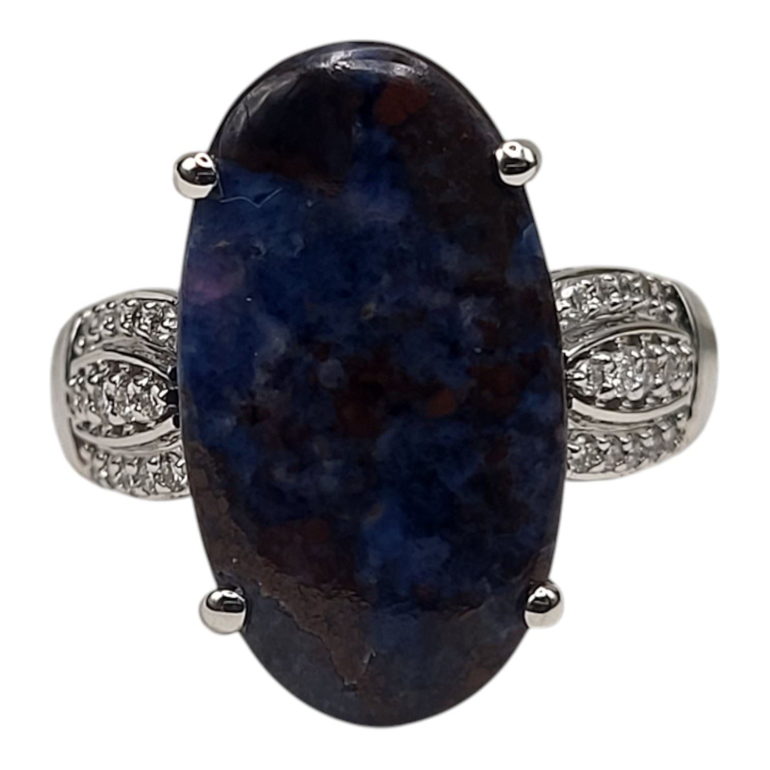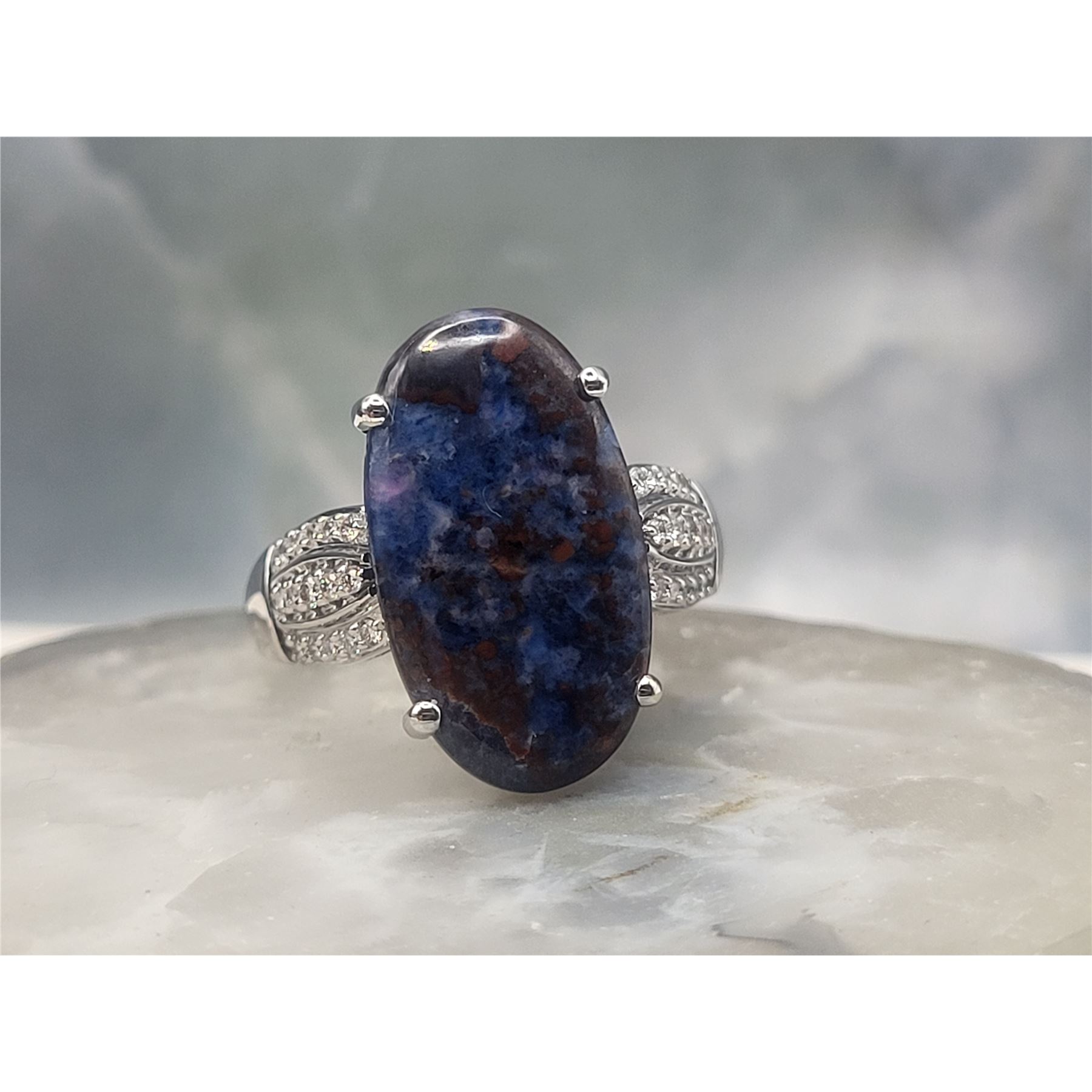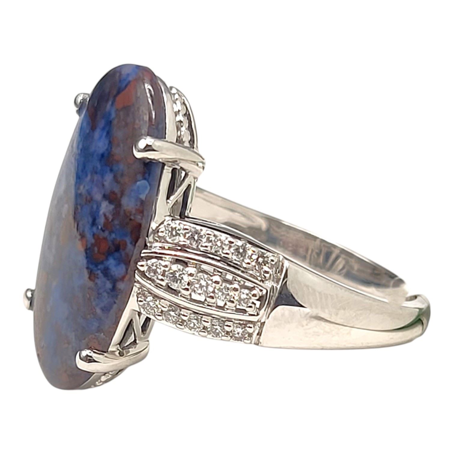 An extraordinary ring in 18K white gold, size 7, weighing 3.59 grams. At its center rests a 4.8 ct oval sugilite cabochon, low-set yet commanding, with a mesmerizing play of color—grape-purple tones enriched by subtle hints of blues and reds. The triple ribbon shoulders sparkle with .18 ctw of round brilliant-cut diamonds (G–H color, SI1 clarity), adding refined brilliance to the bold centerpiece. Finished with an ornate yet supportive under gallery, this ring is both striking and comfortable, a rare jewel for the collector of distinctive gemstones. See sizing details and other information below. AdminCode: 6282/13-err