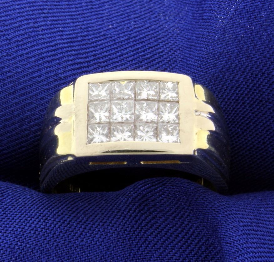 In 18K yellow gold, this ring contains twelve extremely high quality .15ct square diamonds that are VVS clarity/F color. Size 10 3/4 15.5g