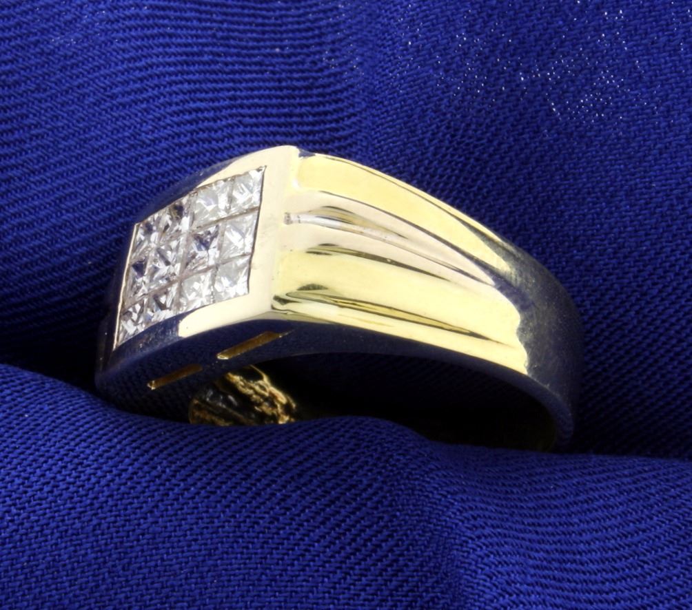 In 18K yellow gold, this ring contains twelve extremely high quality .15ct square diamonds that are VVS clarity/F color. Size 10 3/4 15.5g
