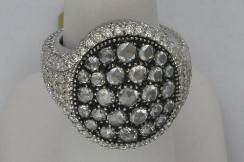 18K WHITE GOLD NEIMAN MARCUS DIAMOND DESIGNER RING CONTAINING A CENTER SECTION OF ANTIQUED ROSE CUT DIAMONDS SET WITHIN A MICRO-PAVE' DIAMOND RING. 7.20 CTS TOTAL WEIGHT, THE RING CONTAINS A SPRING SHANK. 16.6 GMS, ORIGINAL NEIMAN'S RETAIL $12,000.00