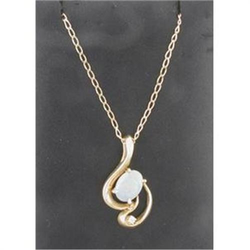 Pretty 6.5MM x 8MM opal shows flashes of green, red and yellow and is set in a free form 18K mounting, accented by one .03 carat diamond. The 20" chain is 14K and a nice color match. together they weigh 3.3 grams.