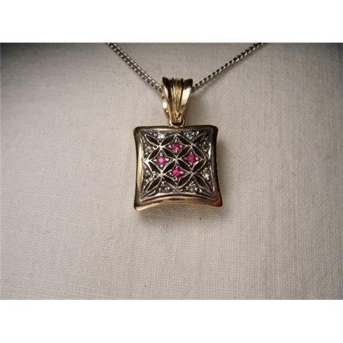 You are looking at an antique 18K pink gold ruby and diamond filigree pendant. This beautiful piece features 8 rose cut diamonds with a diameter of 1 mm each and 4 natural round rubies. The pendant measures 1/2 of an inch long by 1/2 of an inch wide. It weighs 5.9 grams. It is in mint condition.