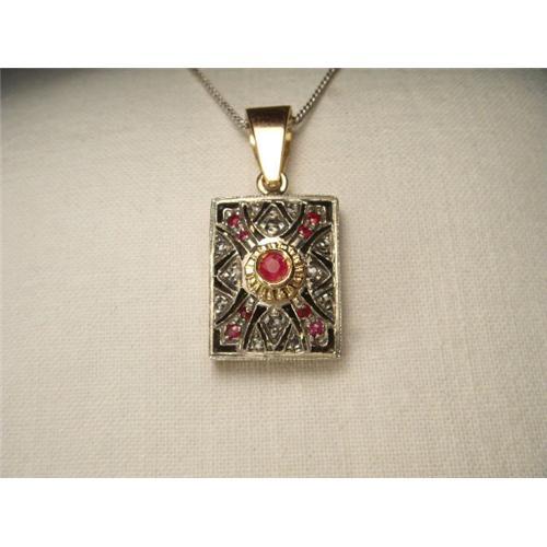 You are looking at an antique 18K pink gold ruby and diamond pendant. This beautiful piece features 12 rose cut diamonds with a diameter of 1 mm each, one natural round ruby measuring 3 mm in diameter and 8 natural round rubies. The pendant measures 1 and 1/4 of an inch long, including the bail, by 9/16 of an inch wide. It weighs 7.2 grams. It is in mint condition.