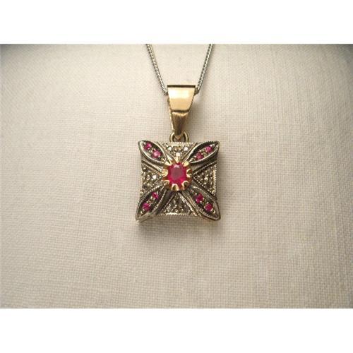 You are looking at an antique 18K pink gold ruby and diamond filigree pendant. This lovely piece features 12 rose cut diamonds and 8 natural round rubies measuring 1 mm in diameter each. The piece also features one natural oval ruby measuring 4 mm by 3 mm. The pendant measures 9/16 of an inch across. It weighs 5.5 grams. It is in mint condition.