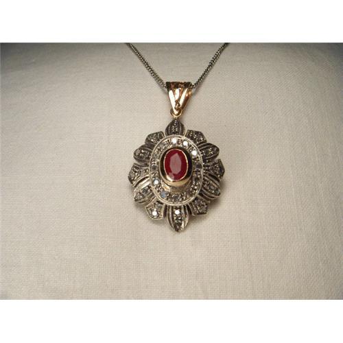 <tr><td>Title:18K Pink Gold Diamond Ruby Floral Pendant</td></tr>