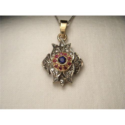 You are looking at an antique 18K pink gold ruby sapphire and diamond pendant. This gorgeous piece features 20 rose cut diamonds measuring 1 mm each, 9 round rubies, and one round sapphire with a diameter of 3 mm. All gemstones are natural. The pendant measures 1 and 1/4 of an inch long, including the bail, by 3/4 of an inch wide. It weighs 4.4 grams. It is in mint condition.