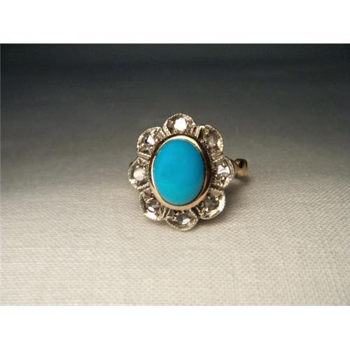You are looking at an antique 18K pink gold diamond and turquoise ring. This beautiful piece features 8 rose cut diamonds with a diameter of 2 mm each. It also incudes one natural oval turquoise measuring 10 mm by 7 mm. The top of the ring measures 11/16 of an inch long by 5/8 of an inch wide. It weigh 7.1 grams. It is a size 7.25. Sizing is avalible. It is in mint condition.