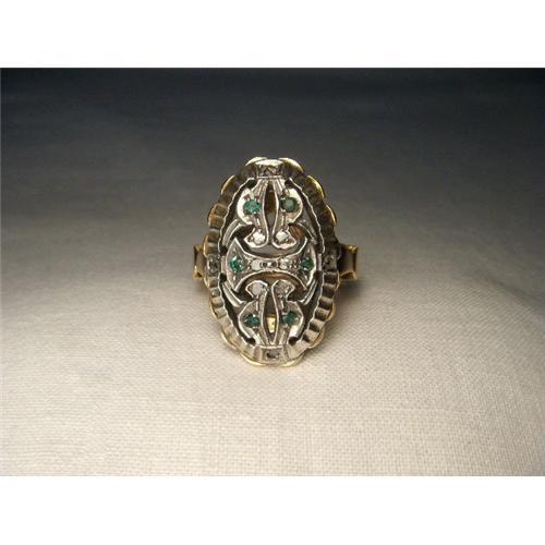 You are looking at an antique 18K pink gold diamond and emerald filigree ring. This lovely piece features 10 rose cut diamonds and 6 natural round emeralds measuring 2 mm each. The top of the ring measures 1 and 1/8 of an inch long by 3/4 of an inch wide. The ring weighs 8.4 grams. It is a size 7.75. Sizing is avalible. It is in mint condition.