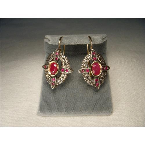 You are looking at a pair of antique 18K pink gold ruby and diamond earrings. Each lovely piece features 12 rose cut diamonds and 4 natural round rubies measuring 1 mm each. Each piece also features one natural oval ruby measuring 6 mm by 4 mm. Each earring measures 1 and 3/16 of an inch long by 3/4 of an inch wide. The pair weighs 9.3 grams. They are in mint condition.