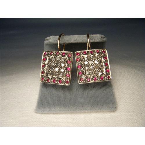 You are looking at a pair of antique 18K pink gold ruby and diamond filigree earrings. Each gorgeous piece features 16 rose cut diamonds measuring 2 mm each and 16 natural round rubies measuring 1 mm each. Each earring measures 1 and 1/8 of an inch long by 5/8 of an inch wide. The pair weighs 13.3 grams. They are in mint condition.