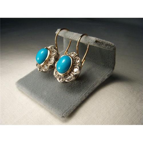 You are looking at a pair of antique 18K rose gold diamond and turquoise floral earrings. Each gorgeous piece features 8 rose cut diamonds with a diameter of 2 mm each. It also incudes one natural oval turquoise measuring 10 mm by 7 mm. Each earring measures 1 and 1/8 of an inch long by 5/8 of an inch wide. The pair weighs 11.2 grams. They are in mint condition.
