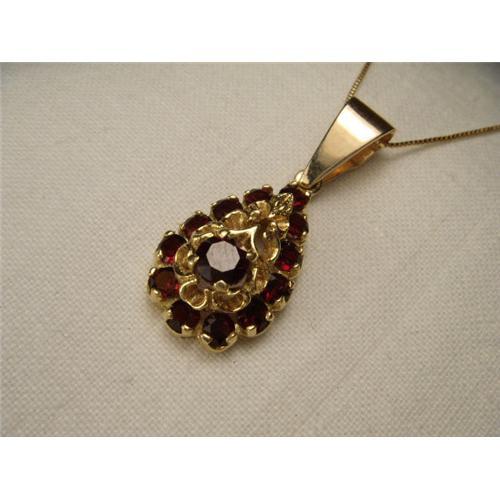 </font></strong>You are looking at an estate 18K pink gold filigree garnet pendant. This beautiful piece features 12 natural round garnets measuring 3 mm each and in the center one larger garnet measuring 5 mm in diameter. The pendant measures 1 and 1/4 inches long, including the bale by 1/2 of an inch wide. It weighs 4.3 grams. It is in mint condition.</font>