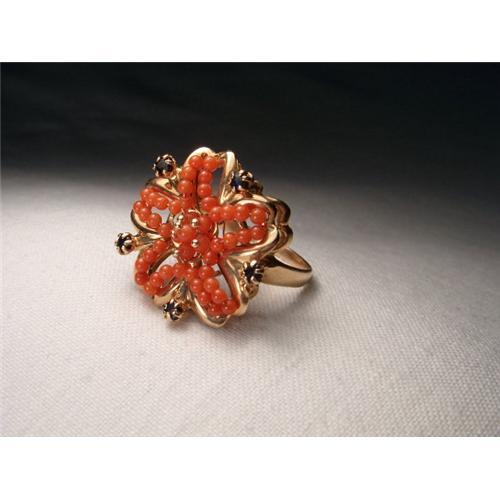 You are looking at a handmade 18K pink gold sapphire and coral ring. This beautiful piece features numerous red corals and 5 natural round sapphires with a diameter of 2 mm each. The top of the ring measures 1 and 7/8 inches in diameter. It weighs weighs 5.3 grams. It is a size 9. Sizing is avalible. It is in mint condition.