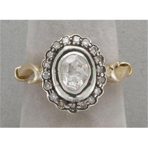 Pretty 18K (unmarked, but tested) ring set with an approximately 6.5MM x 9MM rose-cut diamond (estimated to weight 1/2 carat), surrounded by eighteen briliant-cut .01 to .02 carat diamonds. It is a size 7 and weighs 4.1 grams.