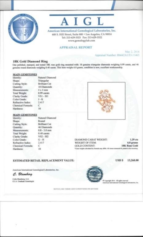 Regarding Appraised Jewelry and Loose Stones - Auctionfarm sends them out to a third party for Retail Replacement Value Appraisals, which are the most common. These types of evaluations are written for insurance needs. This would be the cost to replace the jewelry with an item of equal quality and kind, considered to be the current market price or the replacement value. This type of appraisal is done to protect you in the event of damage or loss of a valuable item. Our appraisals are conducted by independent 3rd Party appraisal firms that utilizes Certified GIA Gemologist. Appraisals should be used for verification of gemstone and/or metal weight, size, and grade only, not actual value. Appraisal value should be considered for insurance purposes only, not actual value, as price varies greatly from retail locations thru out the world. Items should not be purchased with the expectation to resell for appraisal price, or for profit.