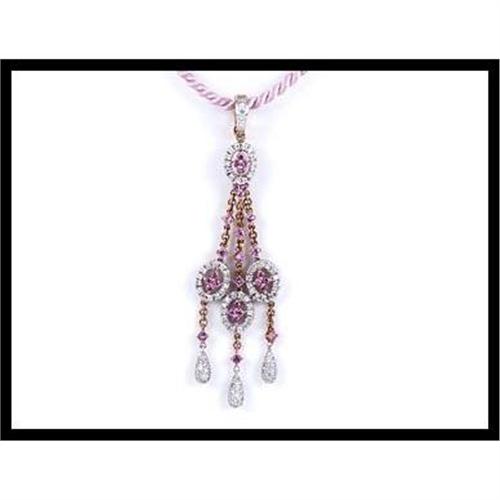 This gorgeous and beautifully made pendant is set with pink sapphires and diamond that have graceful movement when worn. The 29 round cut pink sapphires weighing about ¾ carats and 181 full cut diamonds weighing almost 1.20 carats total. It measures 69mm (2 3/4inches) long x 20mm (3/4 inches) wide