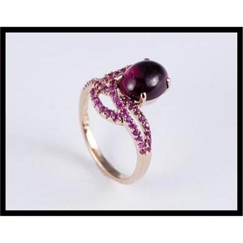 This ring is alluring and luxuriant, with rich color and excellent workmanship. 1 oval cabochon pink tourmaline weighing 2.92 carats is set in 18K rose gold with 42 round cut sapphires that weigh .51 carats TW, The size 6-3/4 ring measures 16 millimeters (5/8 inches) x 11 millimeters (7/16 inches).