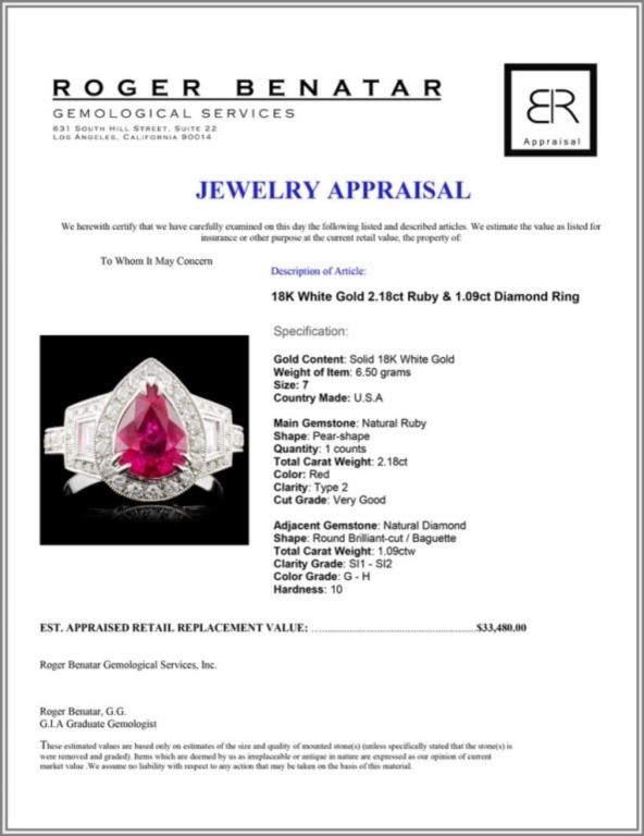 Estimated Retail Replacement Value: $33,480.00Ref: WAG13392Item no.: FA2054477021-BR6408ARSpecification:Gold Content: Solid 18K White Gold Weight of Item: 6.50 gramsSize: 7Country Made: U.S.A Main Gemstone: Natural RubyShape: Pear-shapeQuantity: 1 countsTotal Carat Weight: 2.18ctColor: RedClarity: Type 2Cut Grade: Very GoodAdjacent Gemstone: Natural Diamond Shape: Round Brilliant-cut / BaguetteTotal Carat Weight: 1.09ctwClarity Grade: SI1 - SI2Color Grade: G - HHardness: 10 Great Condition - Shipping notes: We ship 4-10 Business day after the clearance of payment. Tracking numbers are emailed once the package(s) are shipped. Most shipments are sent by FEDEX Priority, UPS Priority, or US PRIORITY MAIL INSURED