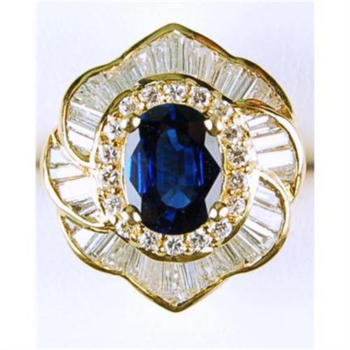 SPECTACULAR 18k Gold 'Ballerina' Style ring featuring a FINE Oval SAPPHIRE = 2.31 CARATS! It is surrounded by FINE Quality DIAMONDS = 2.05 CARATS! The Diamonds are both Round and tapered Baguettes. This is a 'one of a kind' ring Designed by L. Sophia Prinz. The Ring measures 1 inch x 7/8 inch and it IS in MINT condition. There is an Appraisal done in 1990 for $14,000!