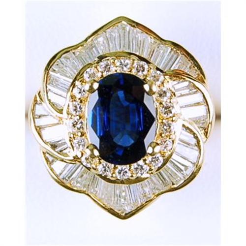 SPECTACULAR 18k Gold 'Ballerina' Style ring featuring a FINE Oval SAPPHIRE = 2.31 CARATS! It is surrounded by FINE Quality DIAMONDS = 2.05 CARATS! The Diamonds are both Round and tapered Baguettes. This is a 'one of a kind' ring Designed by L. Sophia Prinz. The Ring measures 1 inch x 7/8 inch and it IS in MINT condition. There is an Appraisal done in 1990 for $14,000!
