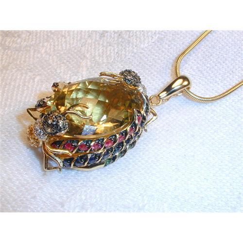 You are looking at a beautiful 18K yellow gold enhancer with natural gemstones. This gorgeous piece contains one large lemon quartz and the following gemstones: 18 rubies, 20 sapphires, 12 tsavorites and several diamonds. The lemon quartz weighs about 20.5 carats. The total weight of the rubies, sapphires and tsavorites is about .20 of a carat. The enhancer weighs 19.2 grams. It measures 1 & 5/8 inches long, including the loop by 3/4 of an inch wide. It is in mint condition.