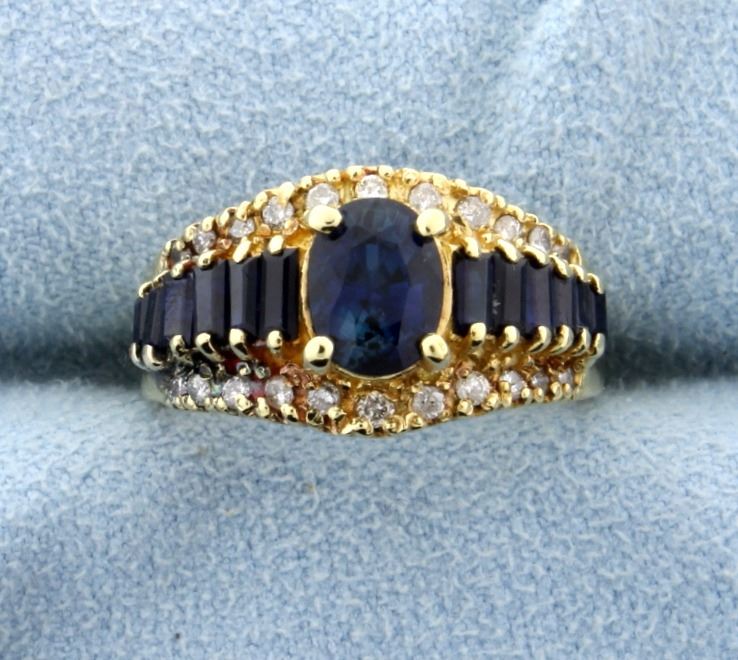 In 18K yellow gold, this ring contains a one carat oval natural sapphire surrounded by twelve rectangle shaped sapphires ranging from 2.5 to 3.5mm long - all excellent quality with deep blue saturation and excellent clarity. It also contains 1/4ct total weight of high quality diamonds. Size 6 6.2g