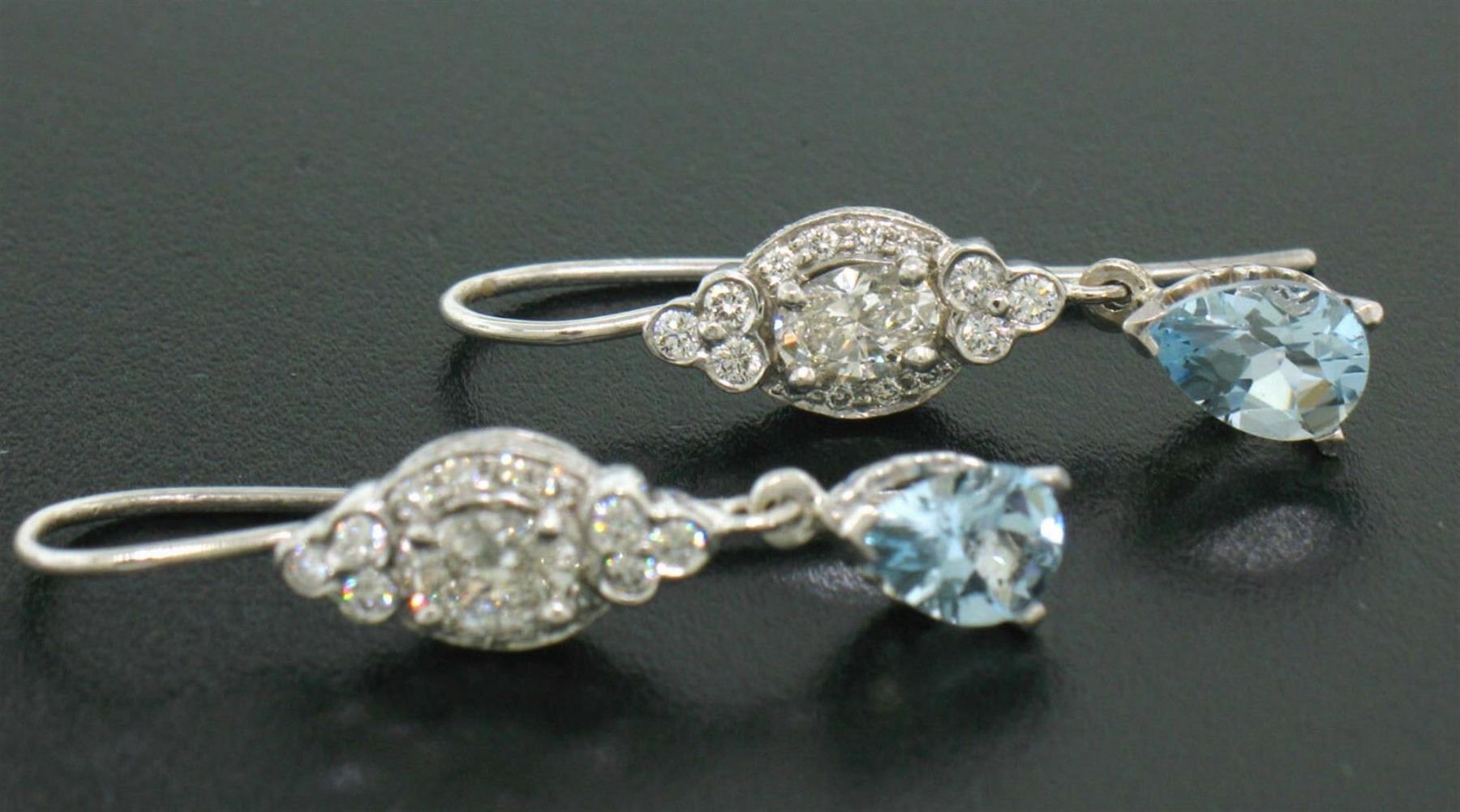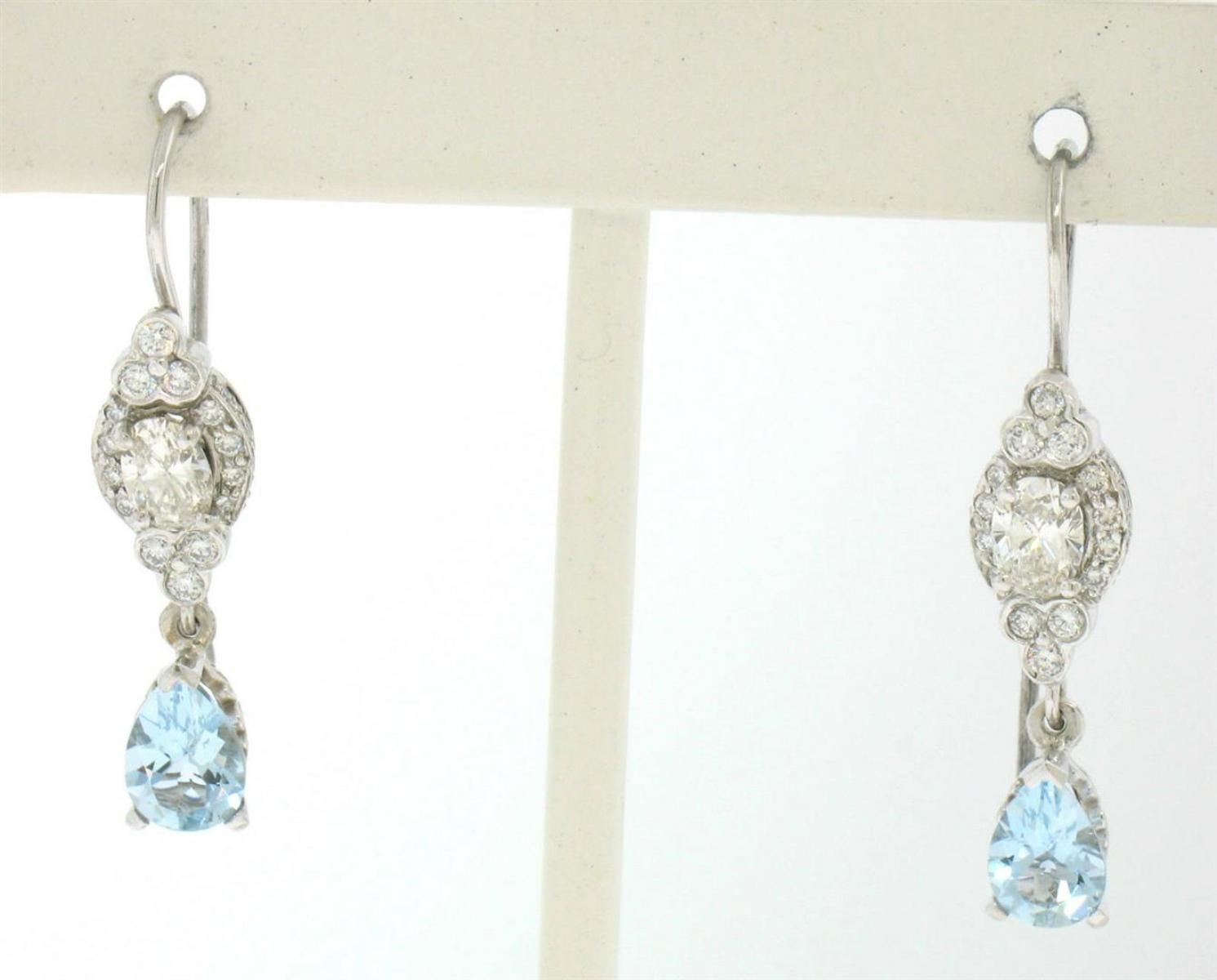 One 18k White Gold 3.26ctw Pear Aquamarine Oval & Round Diamond Drop Dangle Earrings. Item Details: Material: 18K Solid White Gold, Weight: 5.40 Grams , Stone: (2) Natural Genuine Aquamarines - Pear Cut - Prong Set - Pleasant Sky Blue Color - 2.00ctw (approx.), (2) Natural Genuine Diamonds - Oval Cut - Prong Set - I Color - VS1 Clarity - 0.76ctw (approx.), (48) Natural Genuine Diamonds - Round Brilliant Cut - Bezel and Pave Set - G/H Color - VS1 Clarity - 0.50ctw (approx.), Dimensions: 6.78x29.01mm, Backings: French Hook (Pierced ears are required.), Condition: New w/o Tags
