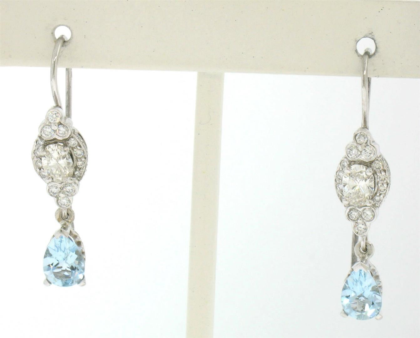 One Pair 18k White Gold 3.26ctw Pear Aquamarine Oval & Round Diamond Drop Dangle Earrings. Item Details: Material:  18K Solid White Gold, Weight:   5.40  Grams , Stone:   (2) Natural Genuine Aquamarines - Pear Cut - Prong Set - Pleasant Sky Blue Color - 2.00 ctw (approx.), (2) Natural Genuine Diamonds - Oval Cut - Prong Set - I Color - VS1 Clarity - 0.76ctw (approx.), (48) Natural Genuine Diamonds - Round Brilliant Cut - Bezel and Pave Set - G/H Color - VS1 Clarity - 0.50 ctw (approx.), Dimensions:  6.78x29.01mm, Backings:   French Hook (Pierced ears are required.), Condition:   New w/o Tags