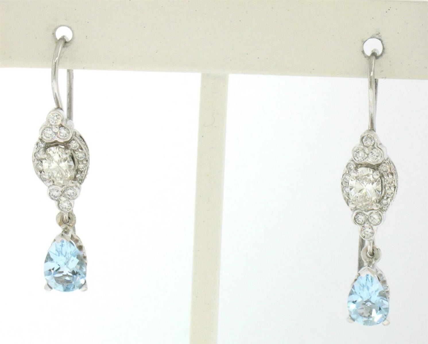 One Pair 18k White Gold 3.26ctw Pear Aquamarine Oval & Round Diamond Drop Dangle Earrings. Item Details: Material: 18K Solid White Gold, Weight: 5.40 Grams , Stone: (2) Natural Genuine Aquamarines - Pear Cut - Prong Set - Pleasant Sky Blue Color - 2.00 ctw (approx.), (2) Natural Genuine Diamonds - Oval Cut - Prong Set - I Color - VS1 Clarity - 0.76ctw (approx.), (48) Natural Genuine Diamonds - Round Brilliant Cut - Bezel and Pave Set - G/H Color - VS1 Clarity - 0.50 ctw (approx.), Dimensions: 6.78x29.01mm, Backings: French Hook (Pierced ears are required.), Condition: New w/o Tags