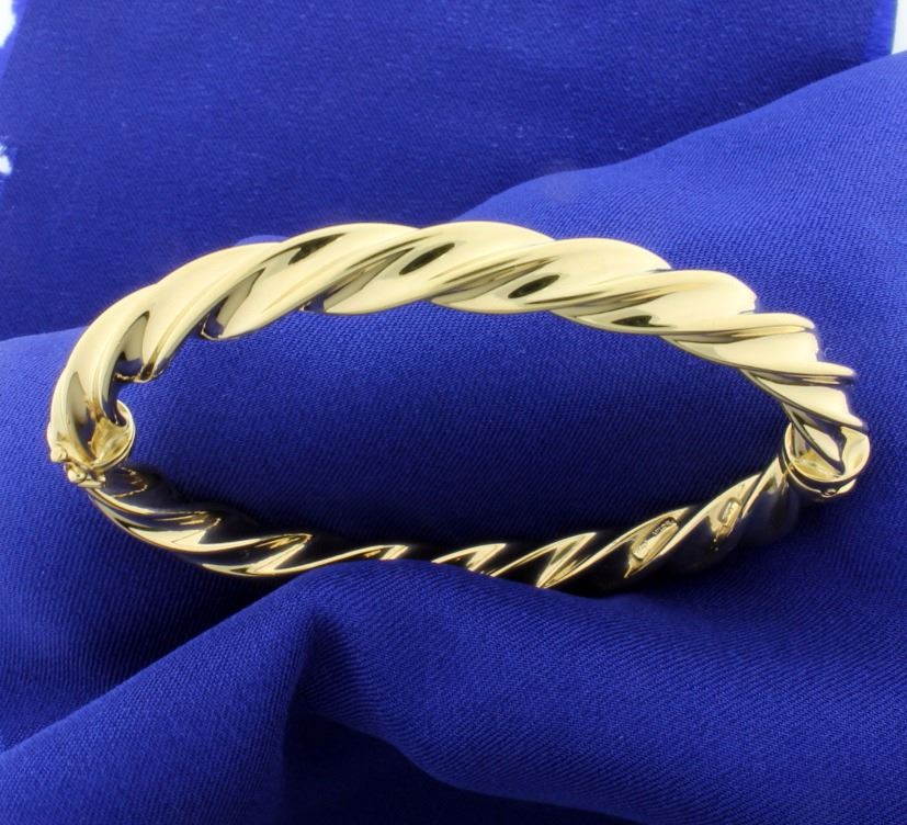 In 18K yellow gold, it has a spiral design with a hinge and safety clasp. The bangle is 3 1/2x2 3/4 inch in diameter and the inside is 2 1/2 inches in diameter. 11.6g