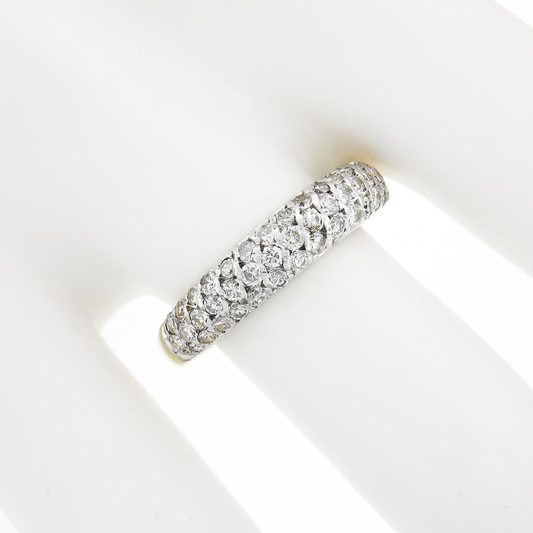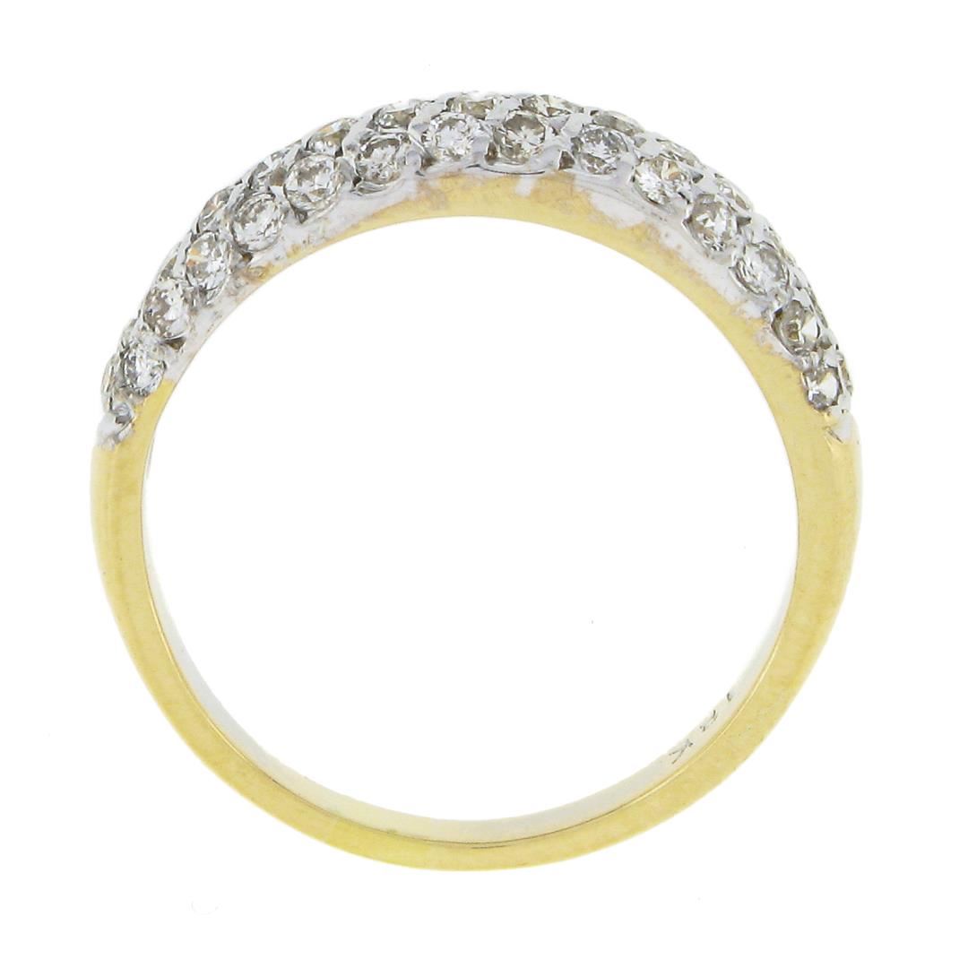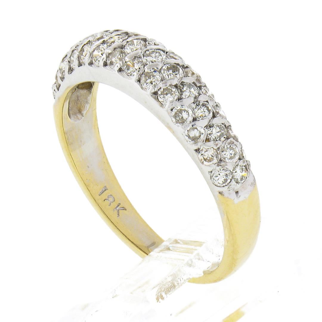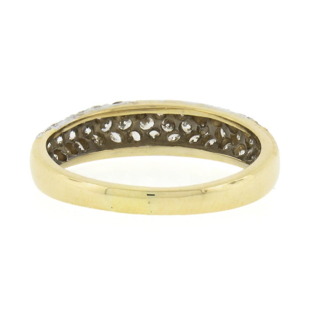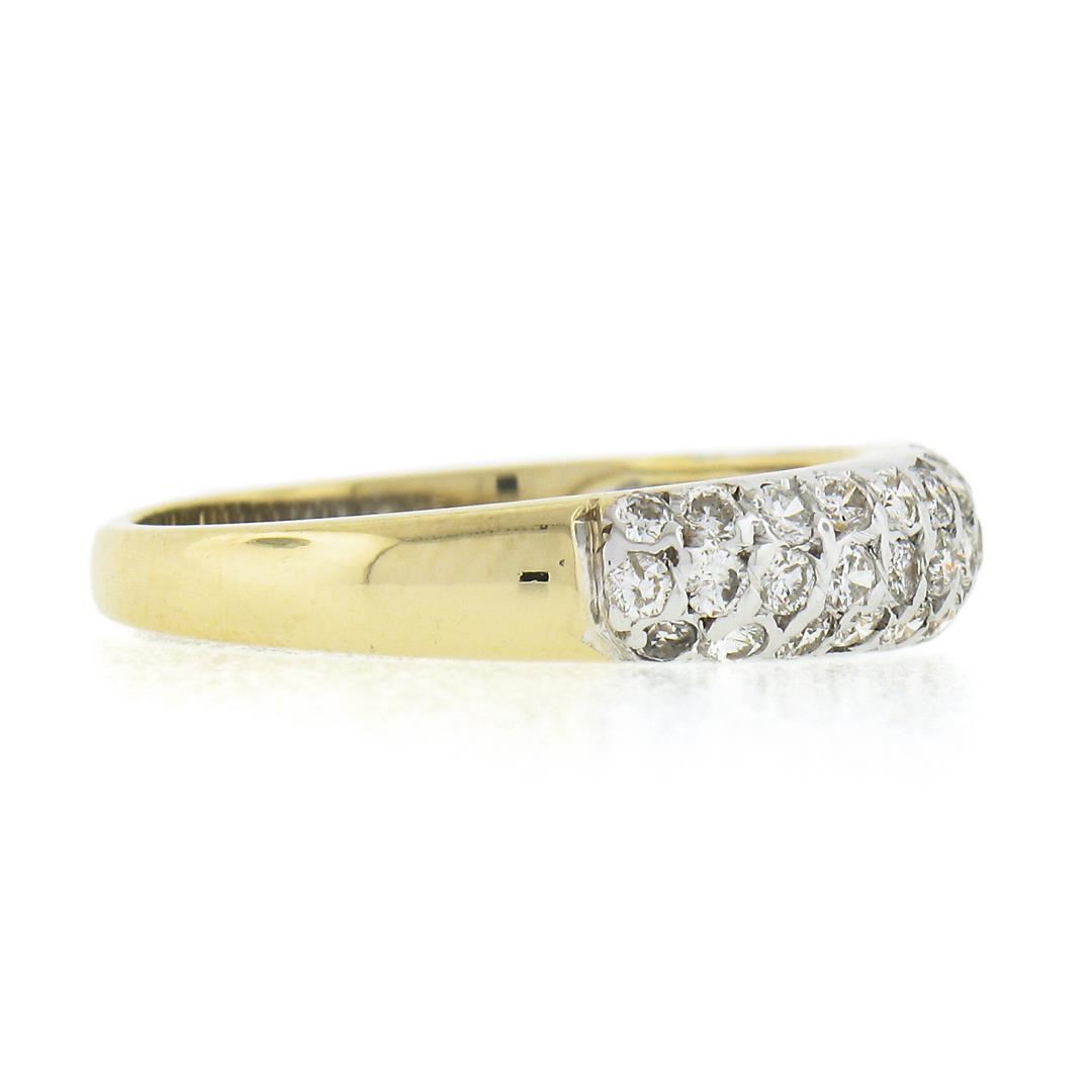 A solid 18k yellow & white gold band ring, with 43 round brilliant cut natural diamonds (H/I - SI1/SI2 w/ a few I1 ; 0.65ctw). The ring is size 7.0, weighs a total of 3.10 grams, and measures 4.6mm wide.