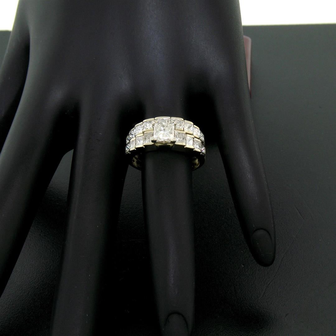 18K TT Gold 2.21ctw EGL Cert. Princess Cut Diamond Engagement & Wedding Ring Set. Please see photos and description for all available information. An estate solid 18k yellow and white gold engagement and wedding ring set, featuring 1 EGL certified princess cut natural diamond (G- SI2; 0.64ct), and 17 princess cut natural diamonds (G- SI1; 1.57ctw). The ring is size 5.75 and The band is size 5.5, weighs a total of 6.24 grams, and measures 8.45mm wide. Comes with all original relevant certifications.