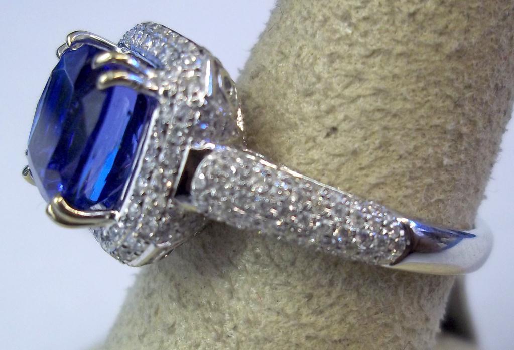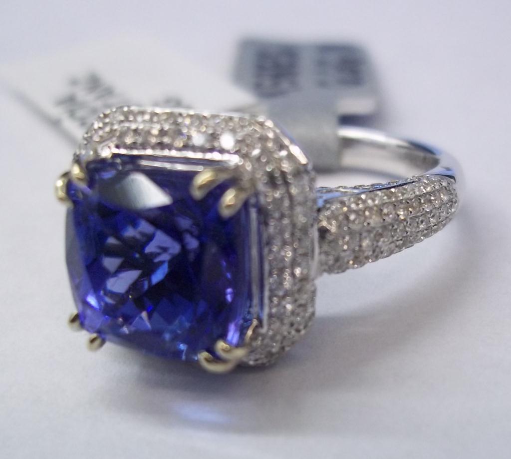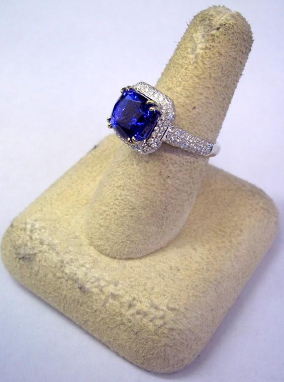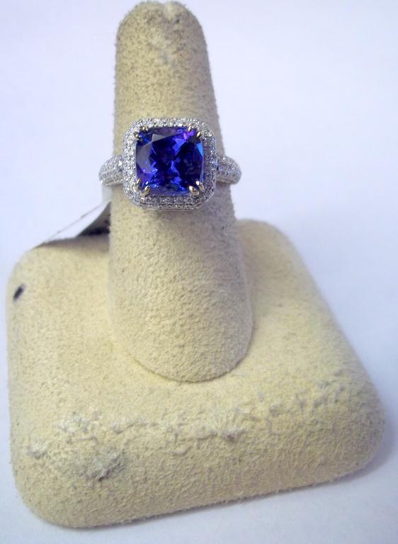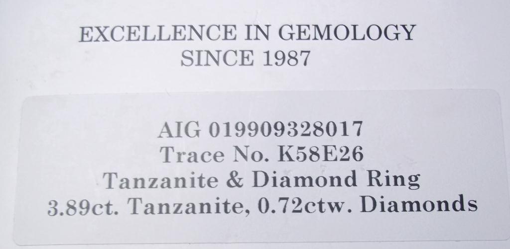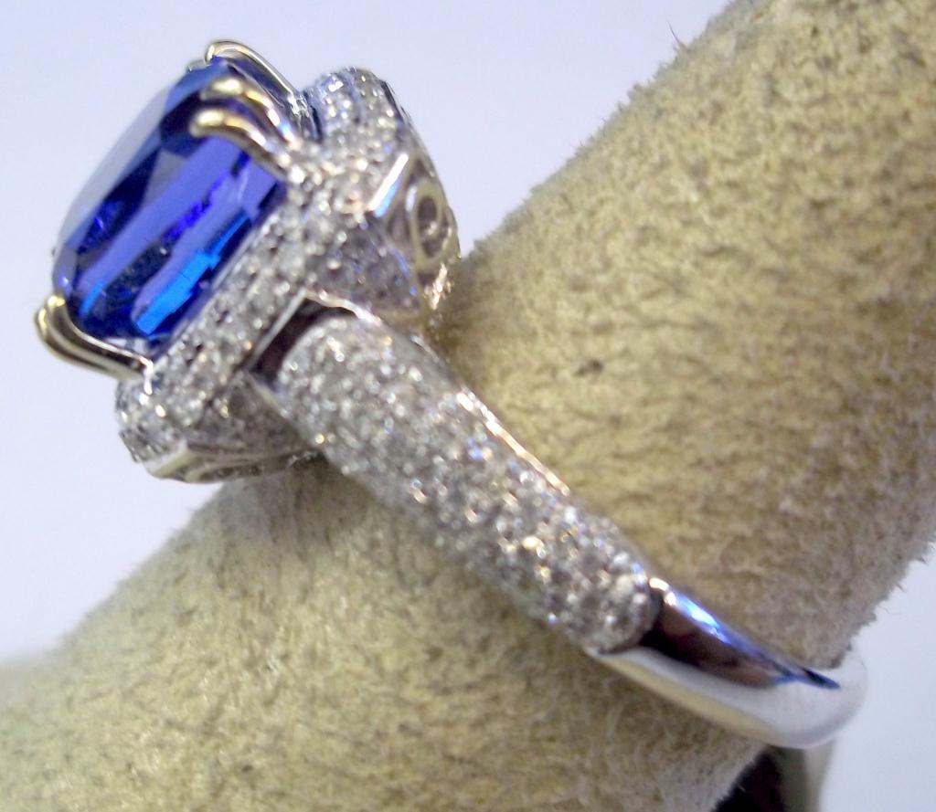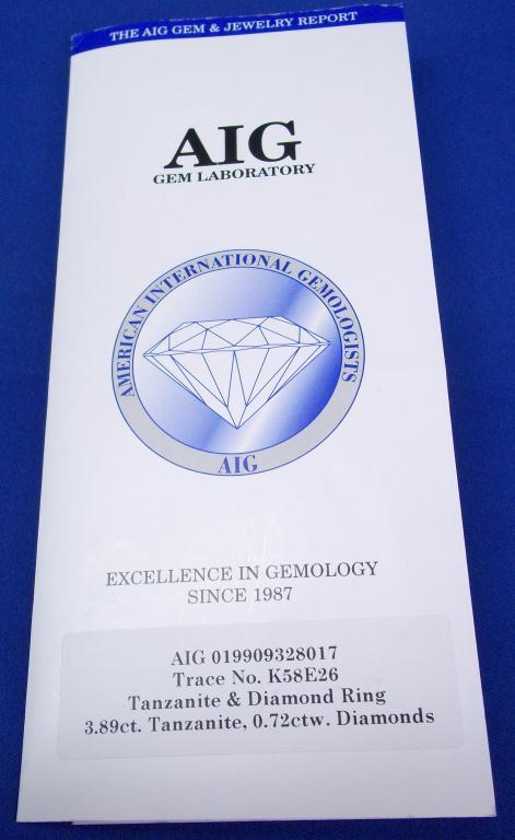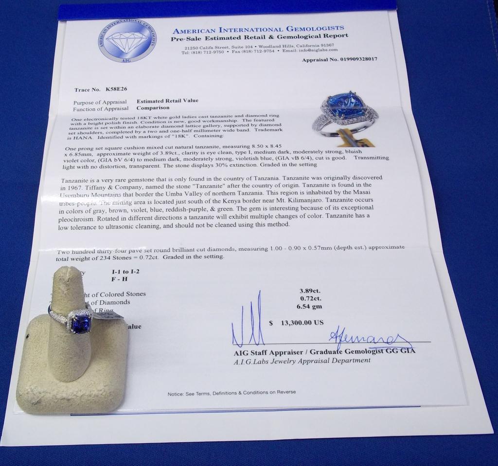 AIG Appraisal $13,300.00. 18K White Gold 3.89 Carat Tanzanite, .72 Carats diamonds, elaborate diamond laaice gallery. Total Weight 6.54 grams.
