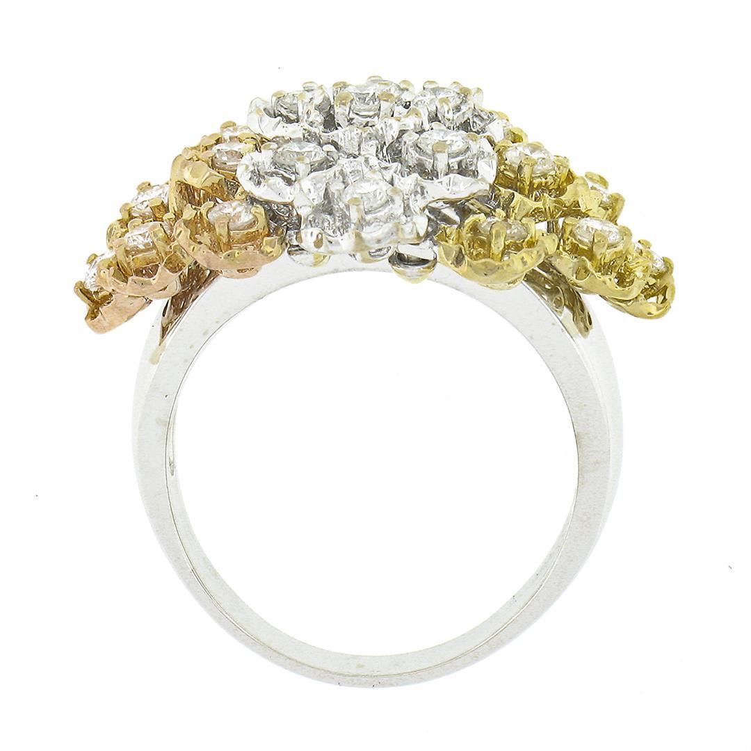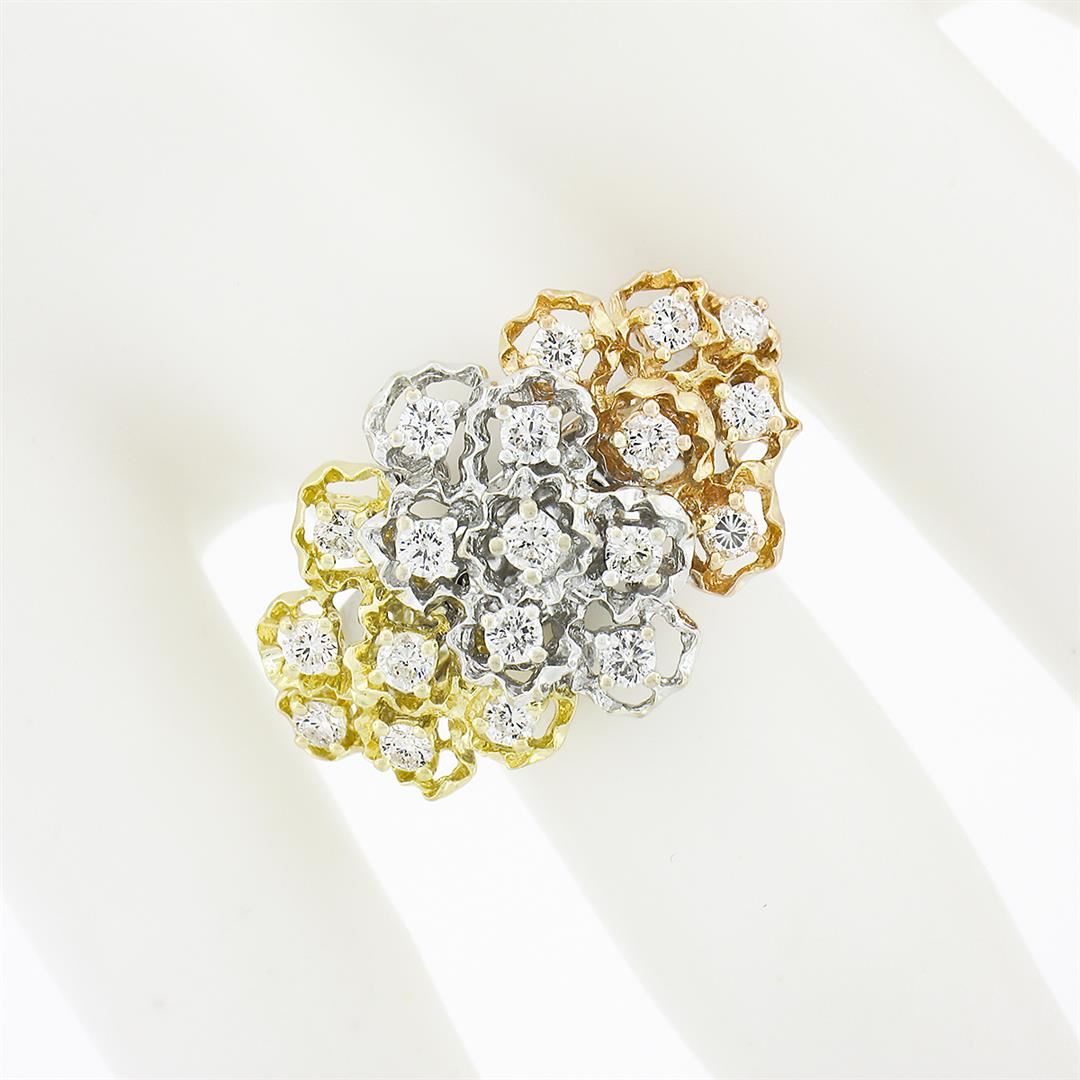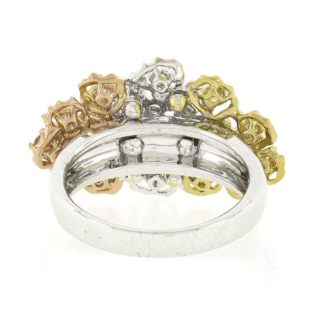 A solid 18k yellow, rose & white gold ring, with 19 round brilliant cut natural diamonds (G/H - VS1/VS2 ; 0.75ctw). The ring is size 7.0, weighs a total of 9.64 grams, and measures 16.45mm wide.