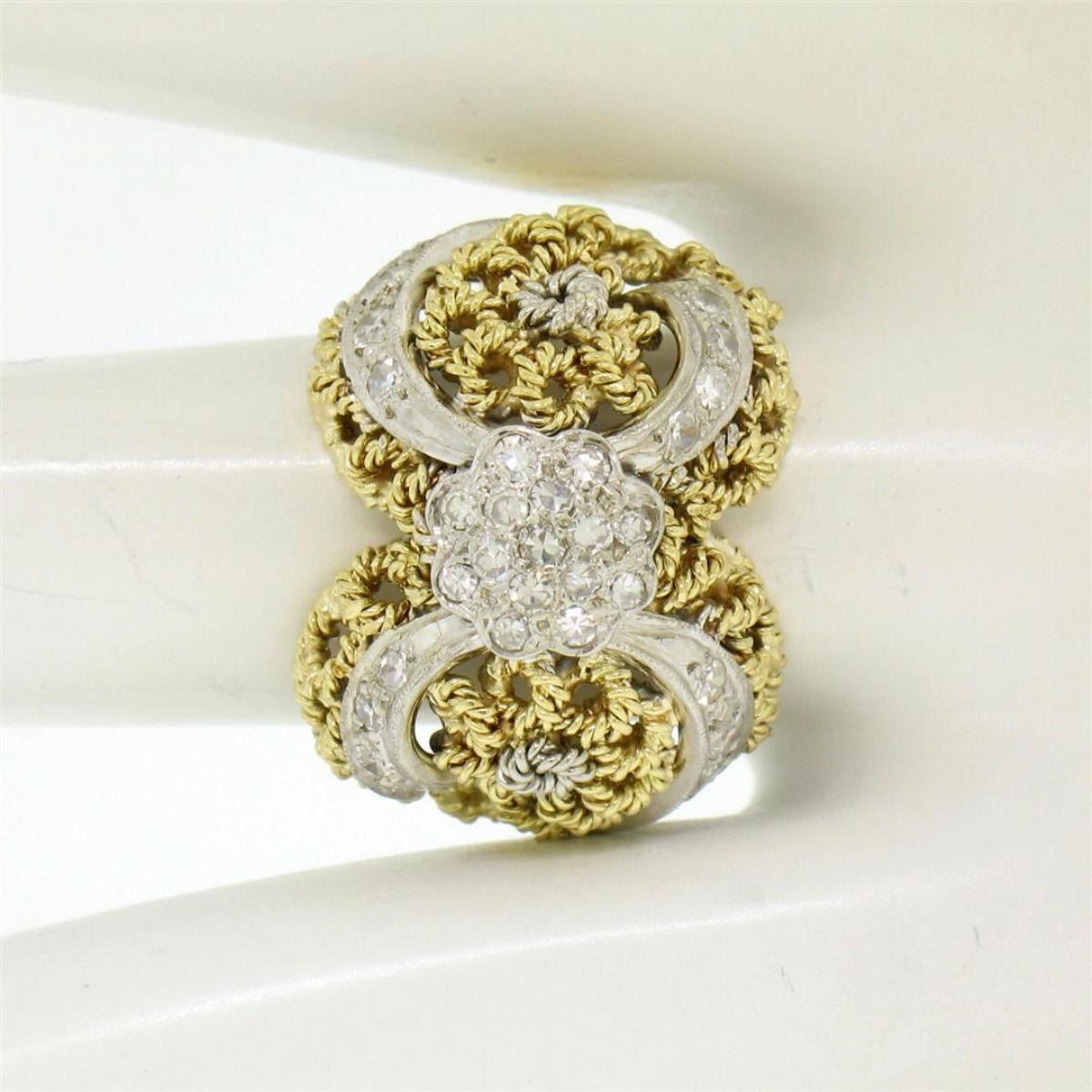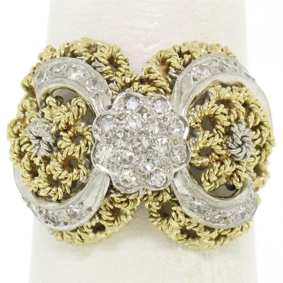 One 18K Two Tone Gold 0.45ctw Single Cut Diamond FINE Open Work Dome Cocktail Ring. Item Details - Material: Solid 18k Yellow and White Gold, Weight: 9.7 Grams, Stone(s): (31) Natural Genuine Diamonds - Single Cut - Pav� Set - F Color - VS1 Clarity - 0.45ctw (approx.), Ring Size: 7.5, Ring Width: 16.75mm, Ring Height: 7.85mm rise off the finger, Condition: Like new!