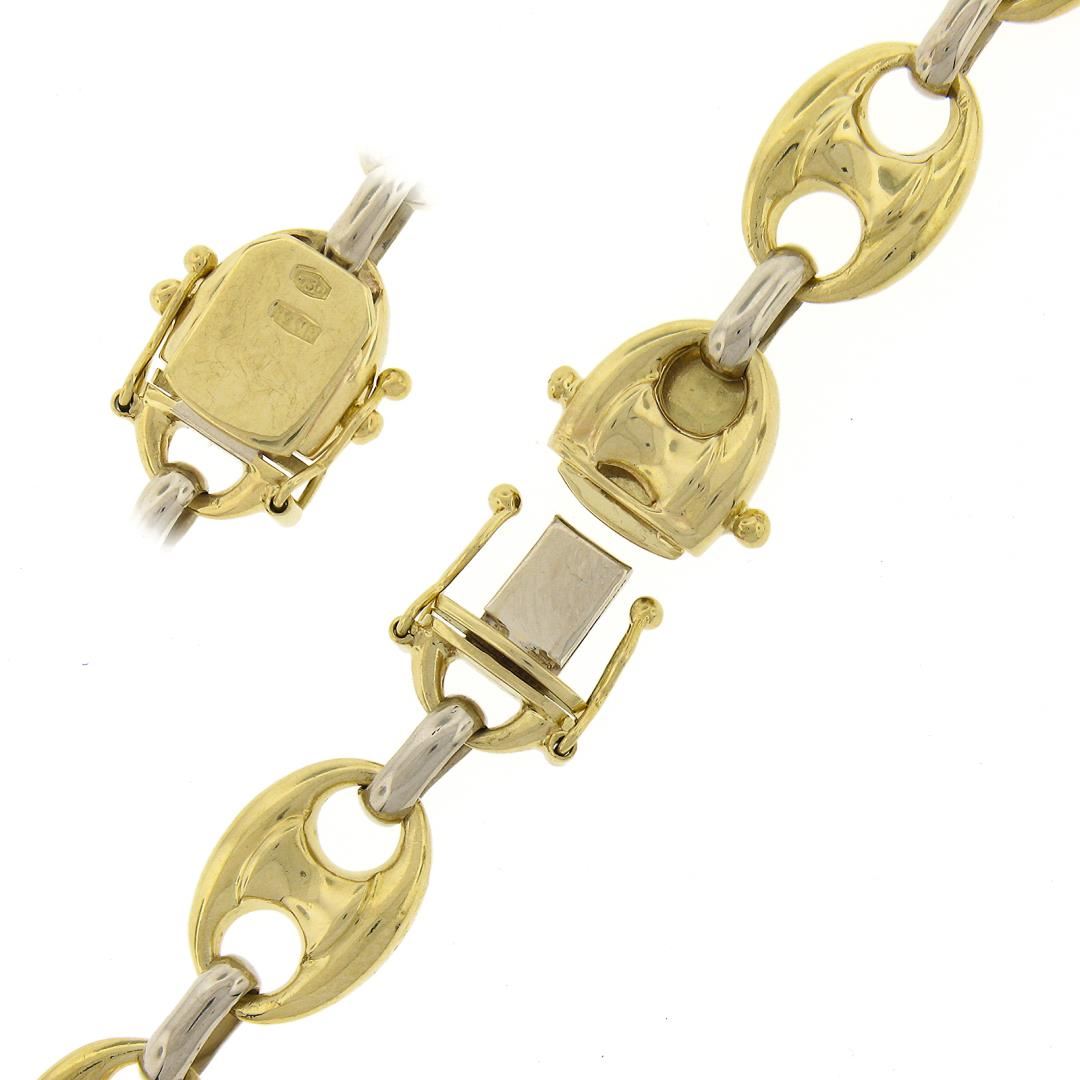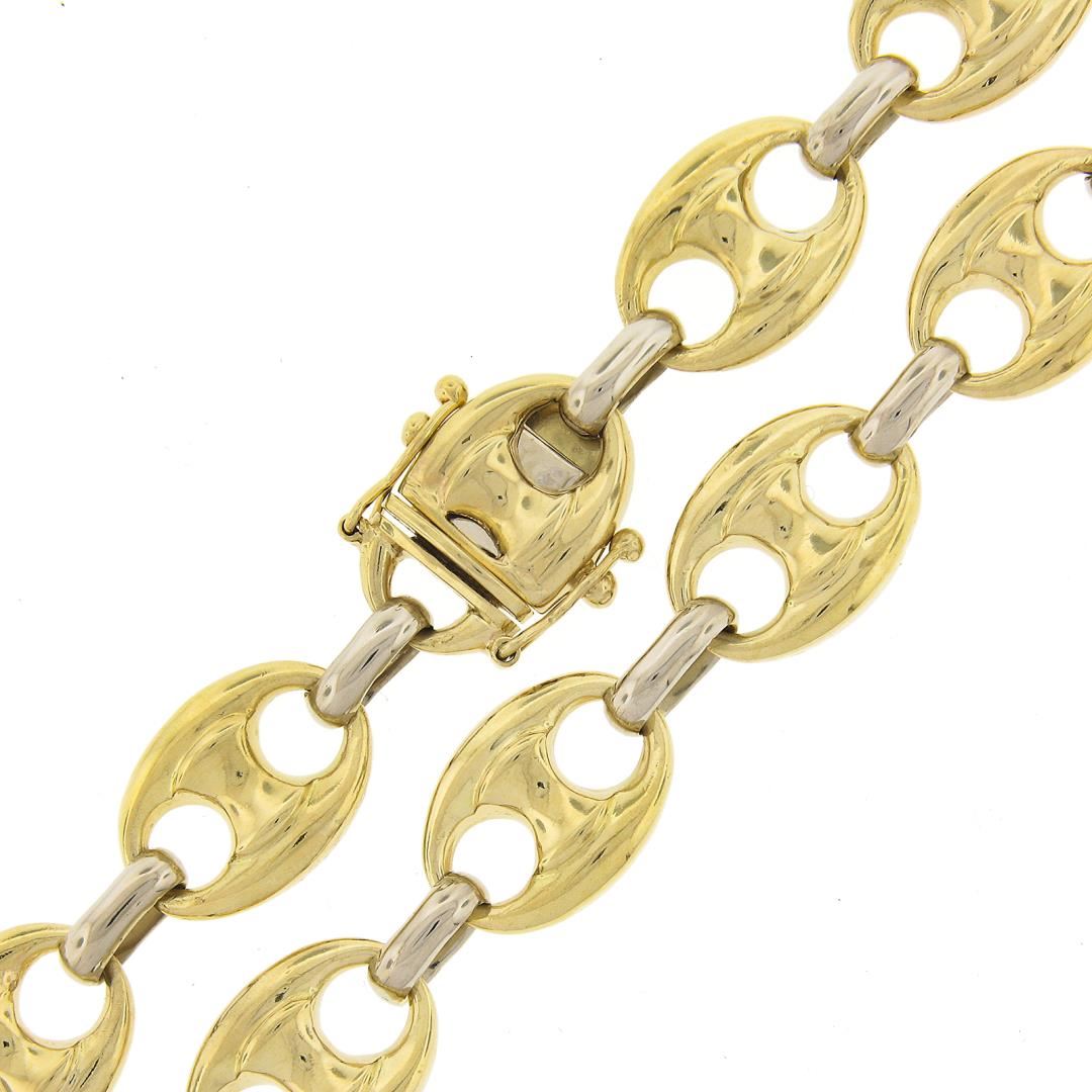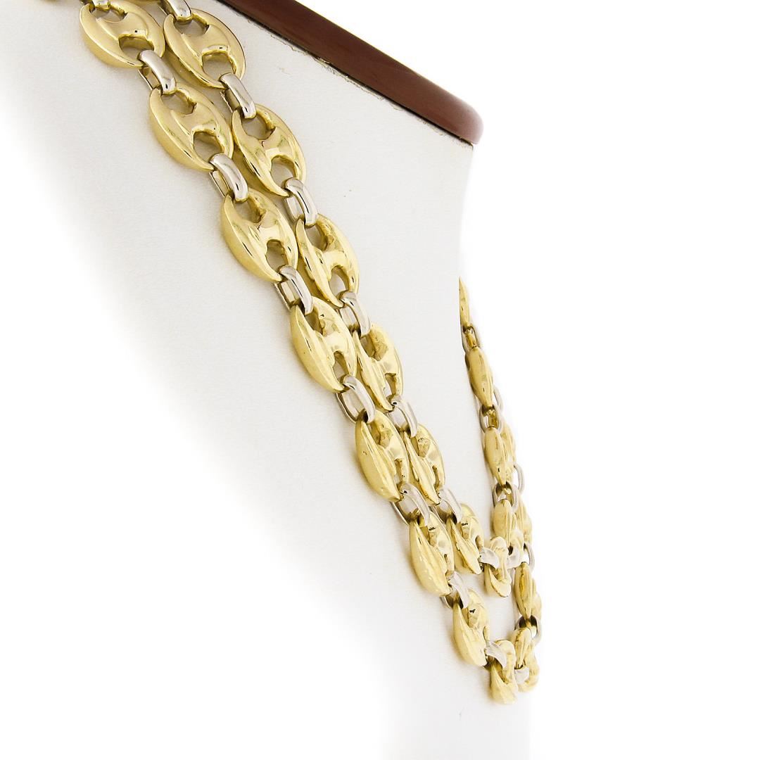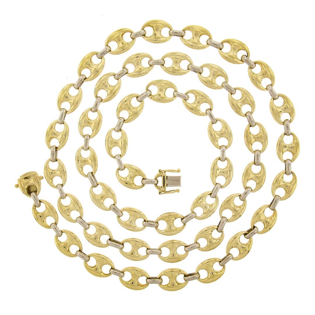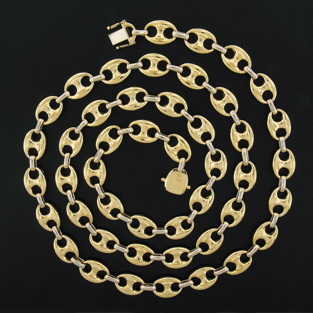 A solid 18k yellow & white gold mariner link necklace. It weighs a total of 114.20 grams, measures 11.6mm wide, and measures 36 inches in length.